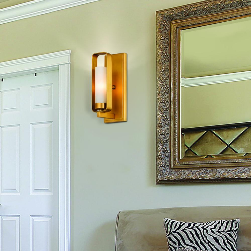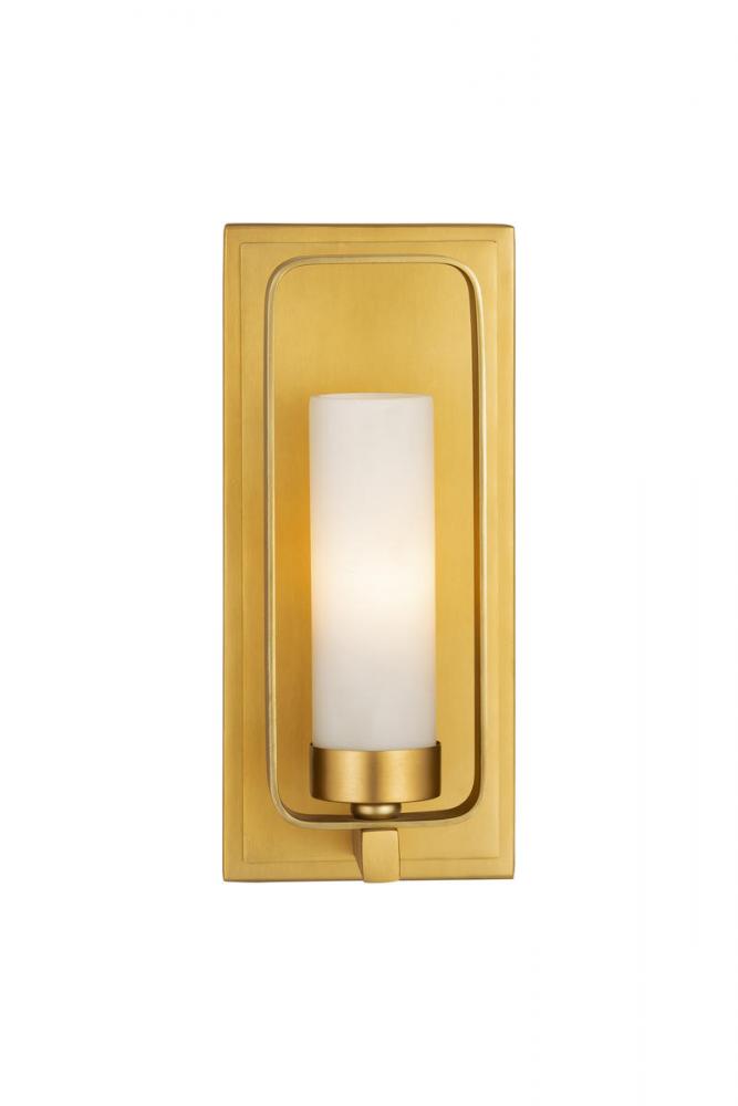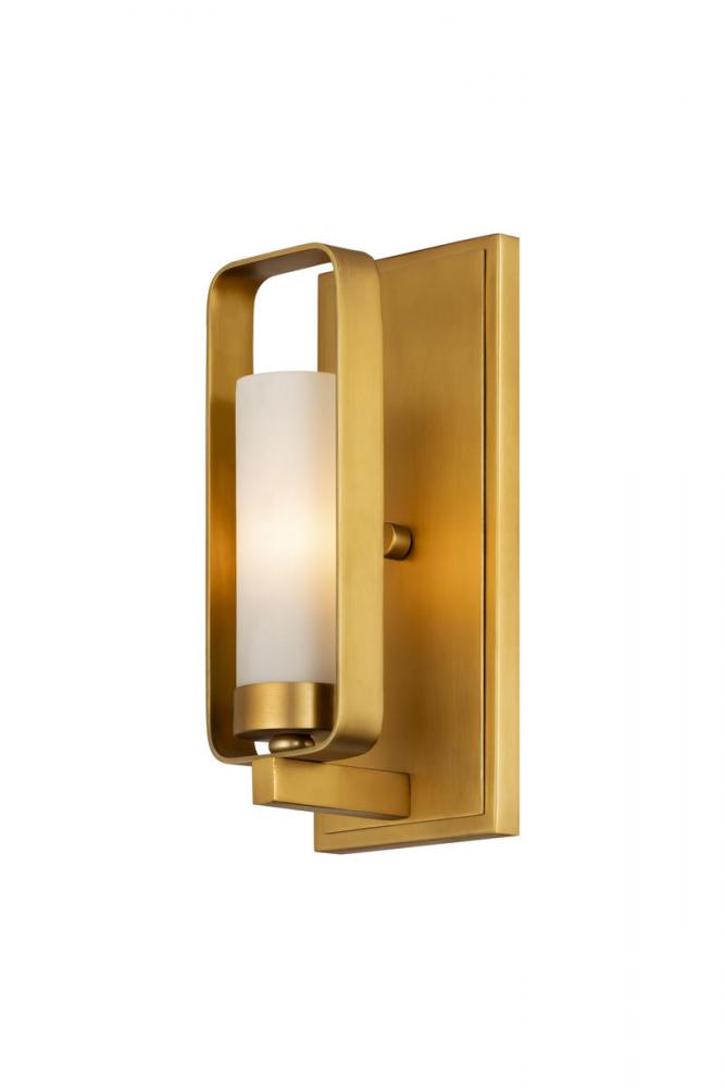 Embrace this lush wall scone that adds contemporary appeal to your space with a touch of symmetrical geometric style. With a tawny brass finish over steel construction, its decadent frame is highlighted by a sultry matte opal shade, casting the perfect glow in your bedroom, bathroom, or hallway.