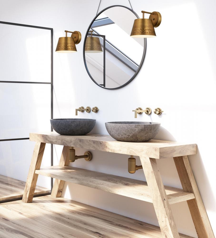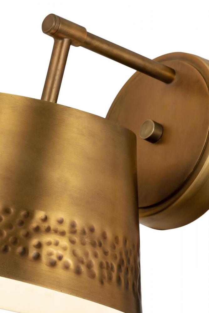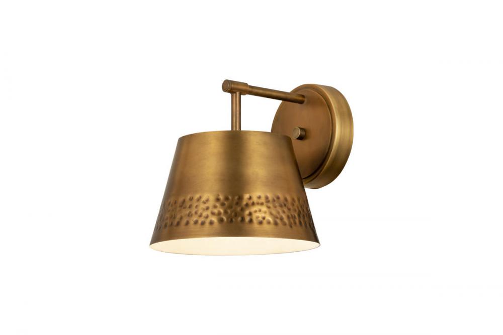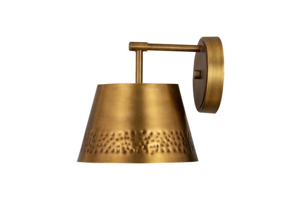 This one-light wall sconce from the Maddox collection creates a seamless, easy-living look for casual spaces in need of extra lighting. Rubbed brass finish iron adds a decadent look to a sconce featuring a conical shade with a texturized hammered belt detail and matching wall mount. Dress up a bathroom or hallway space with this elegant light that incorporates farmhouse and industrial motifs.