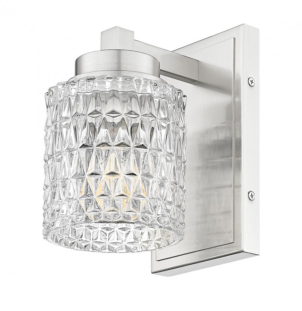 Textural elegance shows up in the diamond patterning of this wall sconce, adding glam style to a timeless design. Its clear glass shade and brushed nickel finish steel frame result in a classic look of sophistication, an excellent way to complement upscale living room, hallways, and bedroom spaces. Use dimming functions to introduce variable levels of soft illumination.