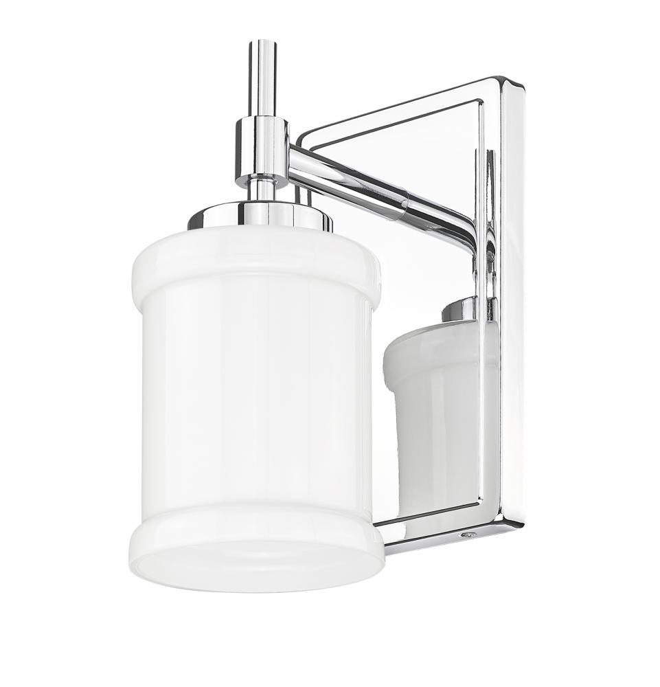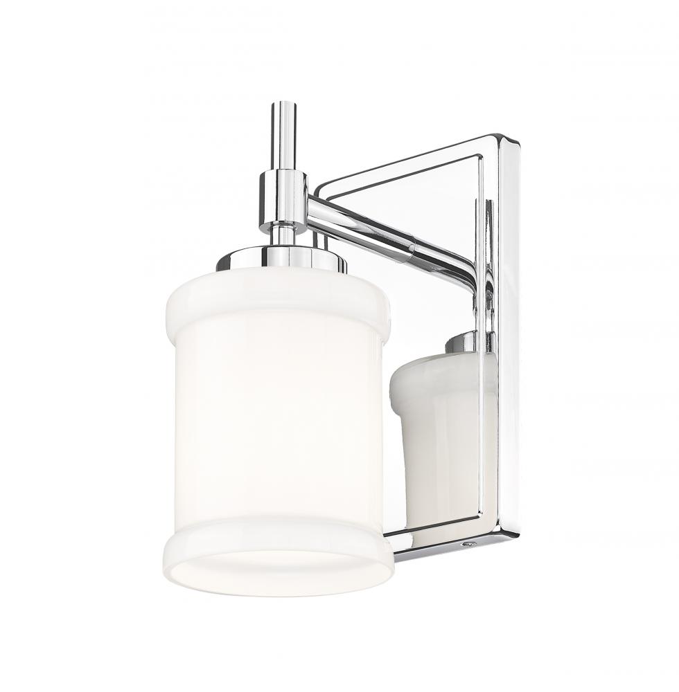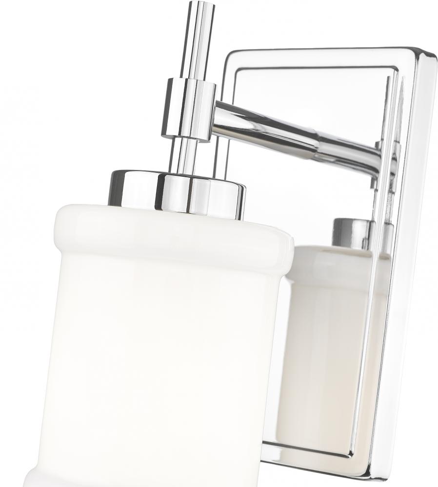 Infused with textural details, this modern one-light sconce is a chic choice for a contemporary vanity. Its minimalist character is embellished with cuffed details at the top and bottom of glossy white opal glass and a decorative arm. A chrome finish gleams in the light and adds a sleek presence in any setting.