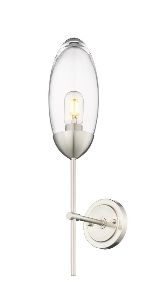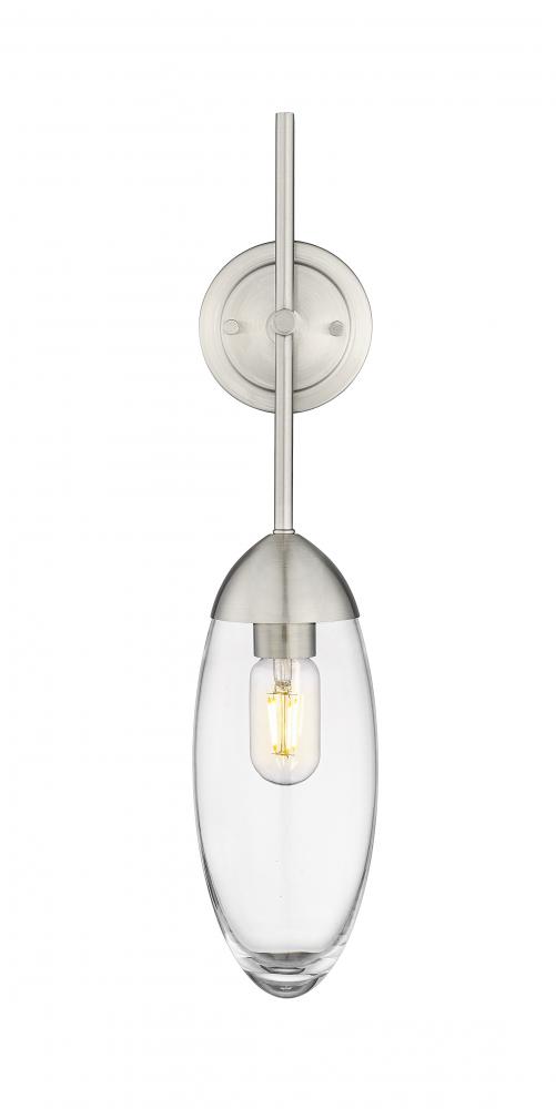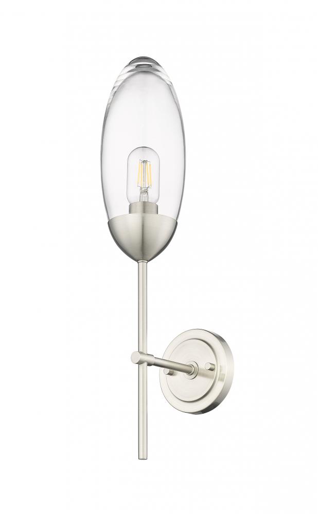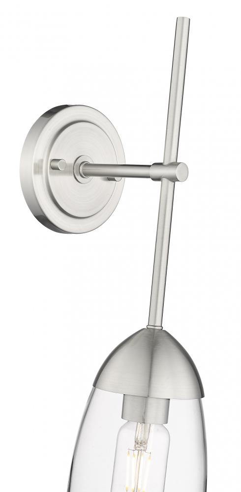 Appoint a sophisticated interior space with lighting that integrates with a tasteful design scheme. This one-light wall sconce from the Arden collection offers a delicate motif blending brushed nickel finish iron with clear glass. A simplified silhouette feels sophisticated as it emits accent lighting in a bath en suite, hallway, or living space.