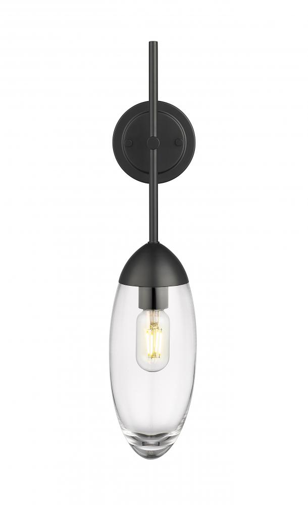 Glam style comes in a simple shape as this fixture designed for impact offers modern and traditional vibes. This one-light wall sconce from the Arden collection offers a delicate motif blending smooth matte black finish iron with a clear glass teardrop shade. A simplified silhouette feels sophisticated as it emits accent lighting in a bath en suite, hallway, or living space.