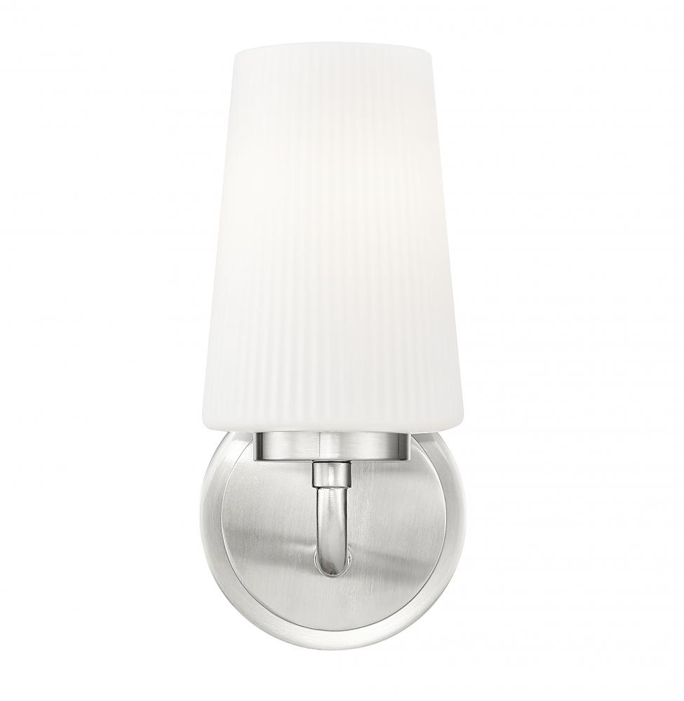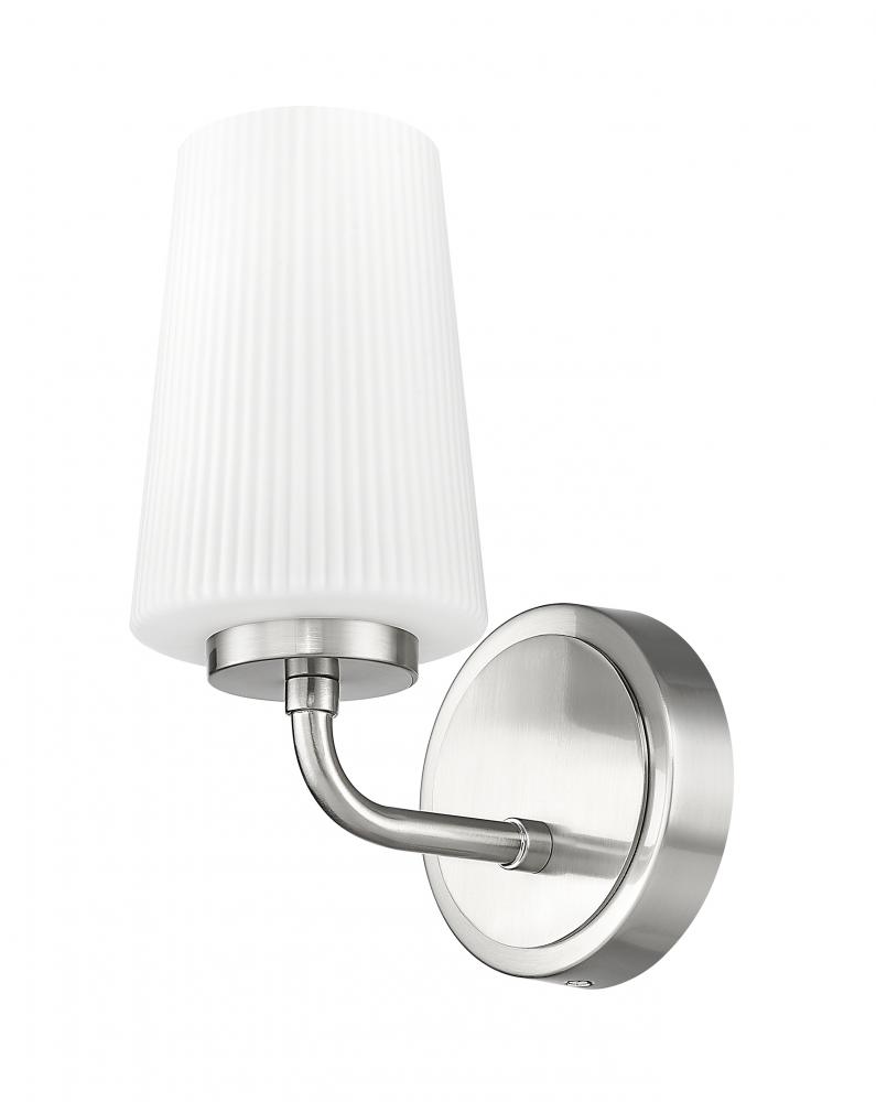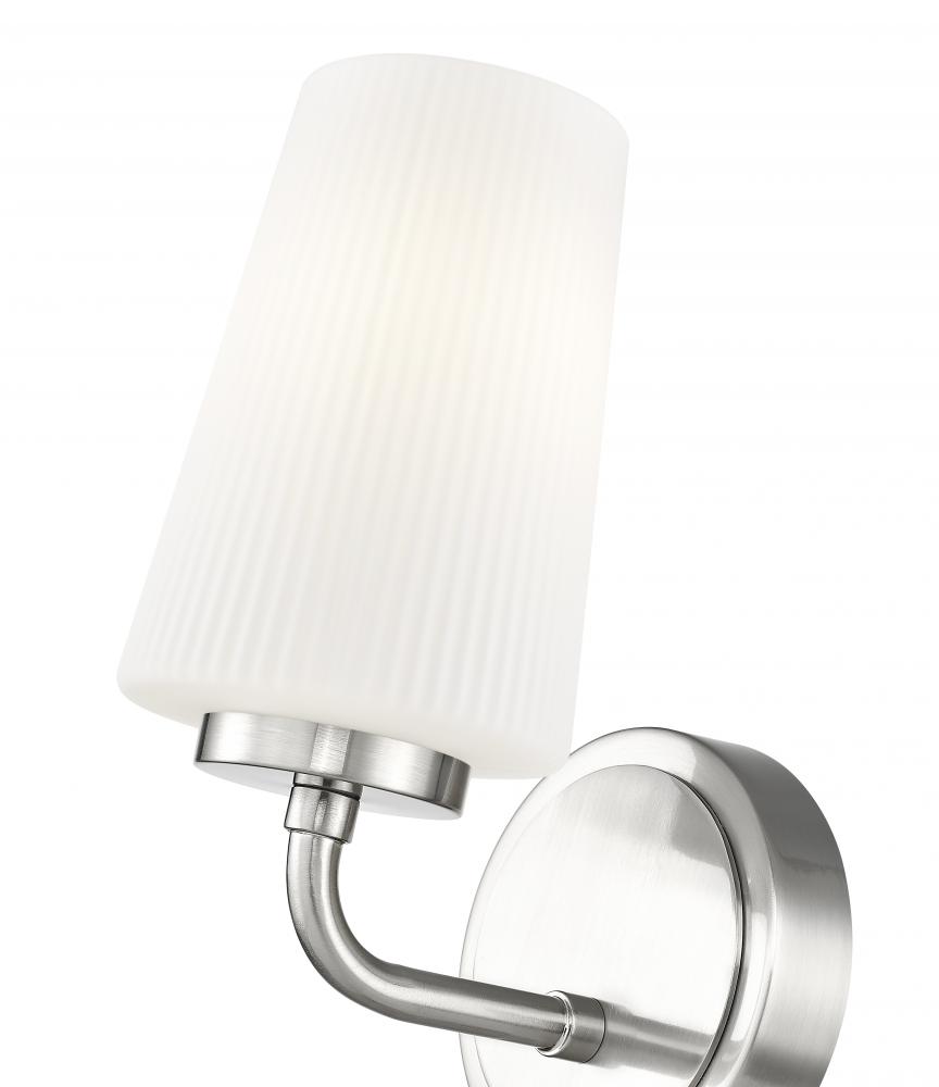 Fine ribbed glass and a tapering, slender silhouette are the hallmarks of this modern wall sconce. Beautiful in a bath or powder room, it evokes subtle restoration or industrial design vibes, creating a chic accent that delivers soft illumination. A combination of sleek opal glass and a brushed nickel finish create timeless elegance.