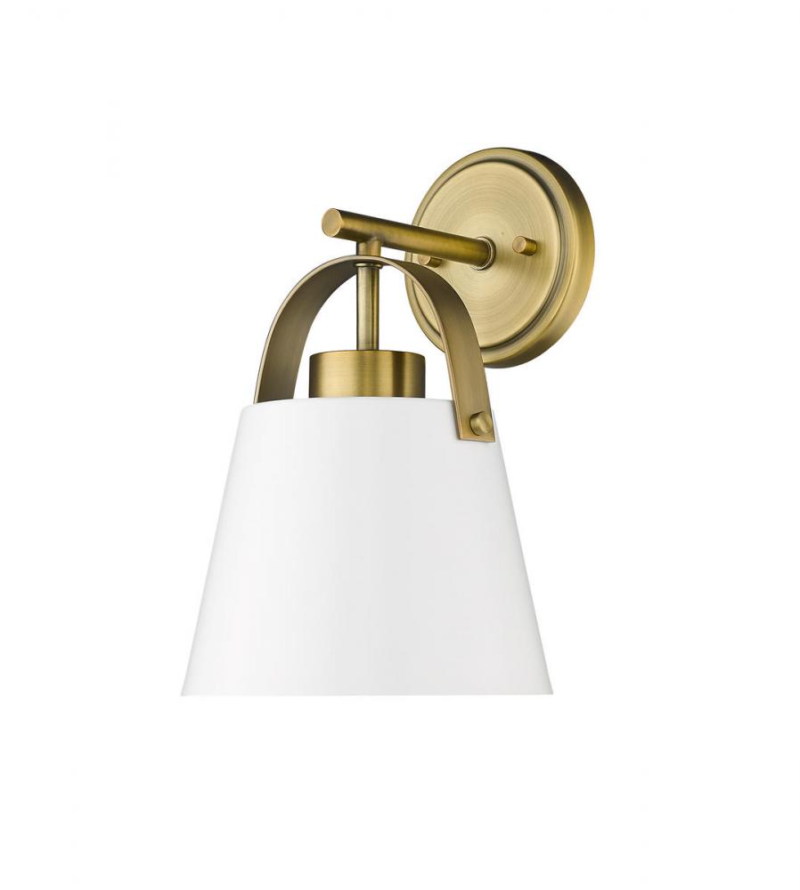 Choose sophistication to bring uplifting elegance in a casual space, adding this single-light wall sconce from the Z-Studio collection. Its tasteful farmhouse industrial design features a conical matte white finish steel shade with heritage brass finish steel accents. Fresh styling contributes to a striking look as it delivers ambient lighting to hallways, bath spaces, and main living areas.