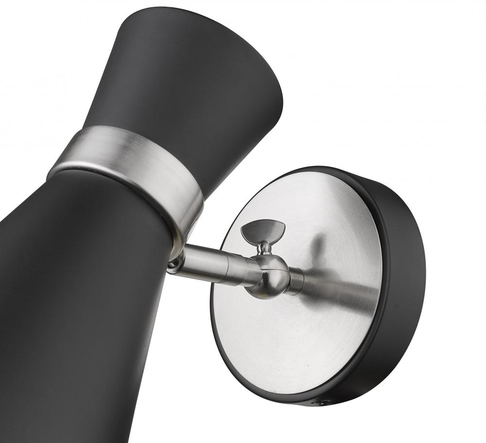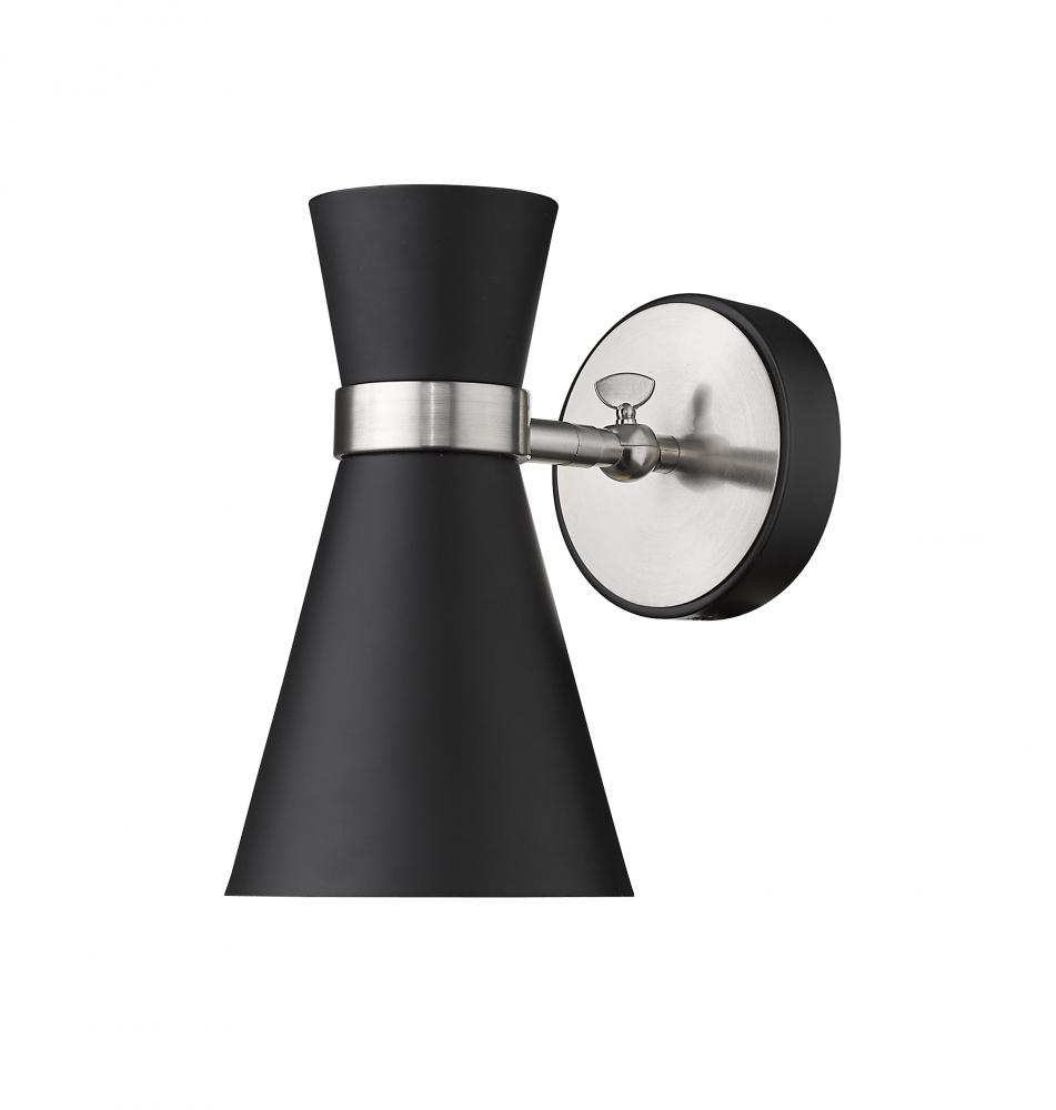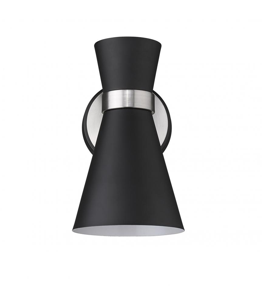 A decorative silhouette shapes industrial influence that adds casual elegance to this matte black finish steel one-light wall sconce. Dress up a bathroom or hallway with this tasteful light trimmed with brushed nickel finish steel. This sconce works perfectly paired with an identical match in a side-by-side arrangement around a doorway or hallway entrance.