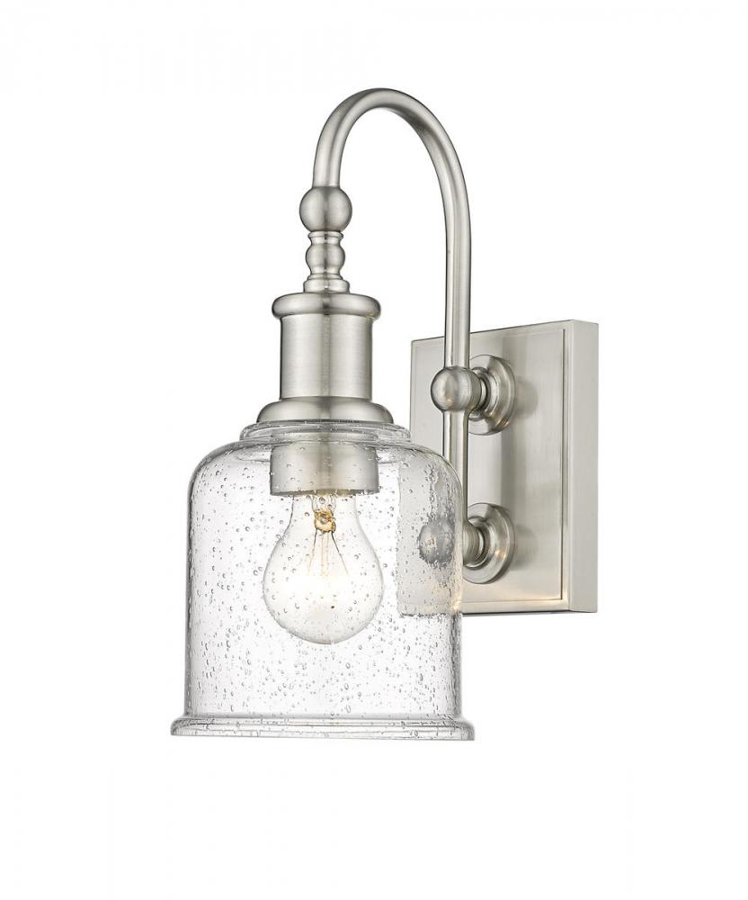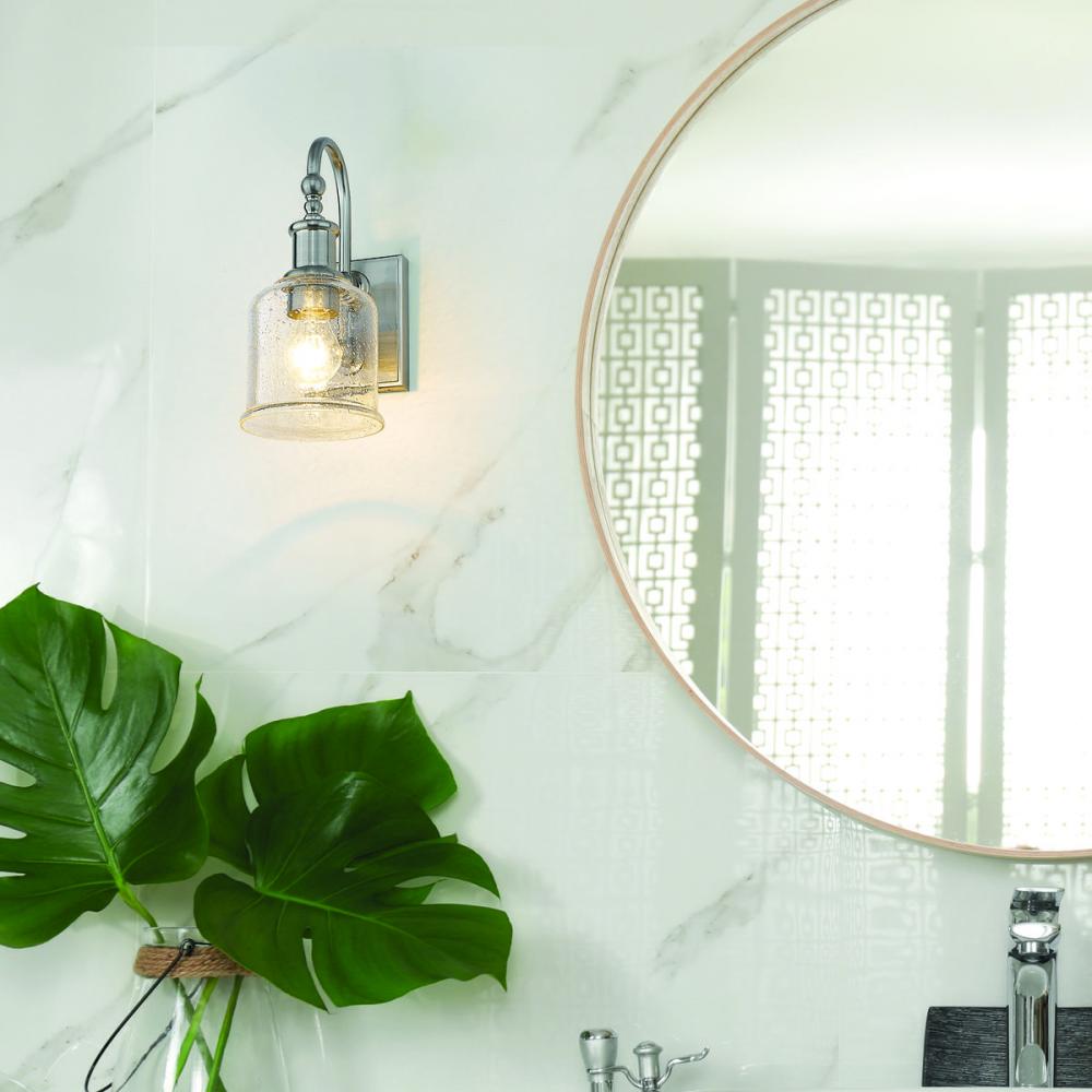 Soft nautical vibes bring a nostalgic romantic vibe to the Bryant one-light wall sconce. Create a themed visual with this tasteful fixture crafted of cool brushed nickel finish steel, blending beautifully with a romantic clear seedy glass shade. A curved arm and lipped shade generate extra charm that stylizes a custom bath space, dining area, or main living room.