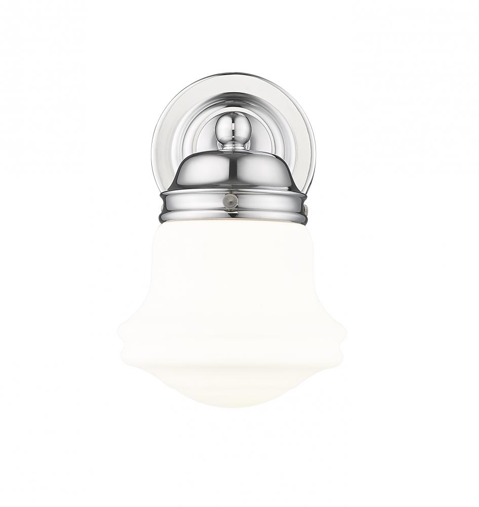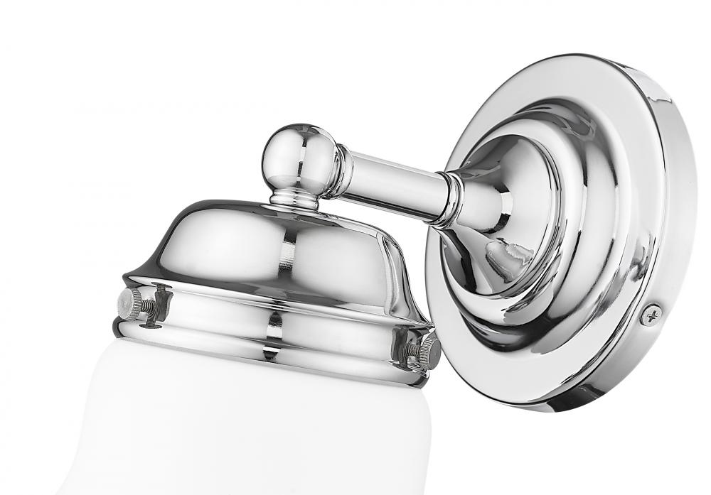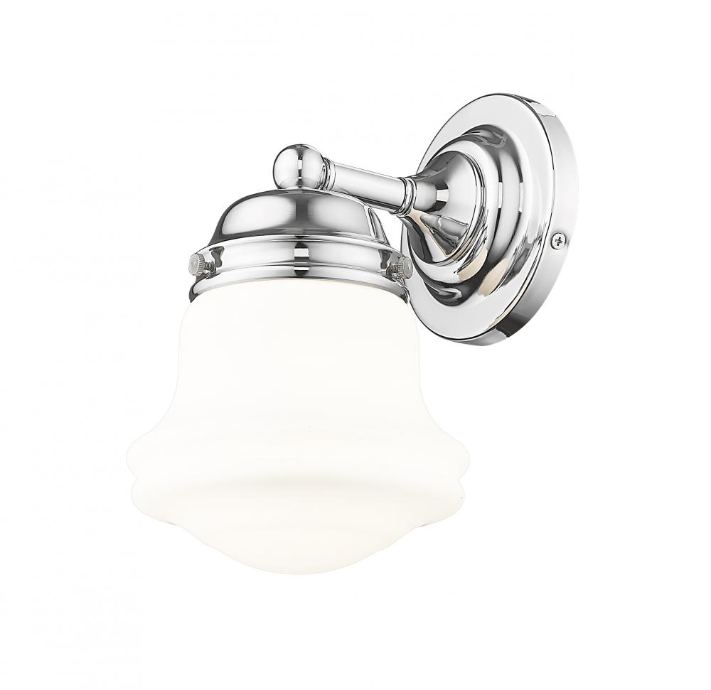 Vintage curves evoke schoolhouse glass in a Mid-Century inspired modern one-light wall sconce. A bright chrome finish complements in a variety of bathrooms and living areas, with matte opal glass that creates soft, diffused illumination perfect for ambiance. A perfect choice flanking a vanity or freestanding tub.