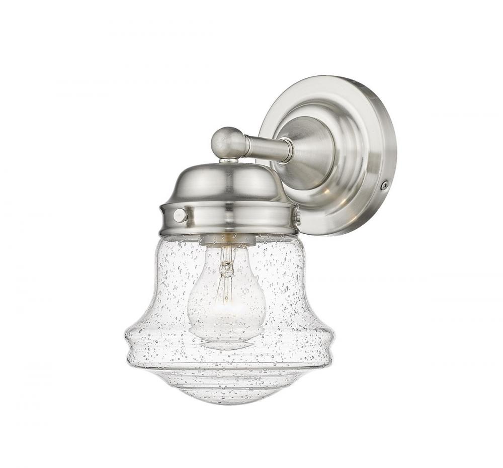 Low-key and tasteful, this one-light wall sconce from the Vaughn collection lifts the mood in a casual space with a charming village-inspired theme. Blending nautical with industrial, this sconce features a clear seedy glass shade in a unique schoolhouse shape, nestled to a cool brushed nickel finish steel frame with a dimensional round wall mount and holder and an extra accent piece.