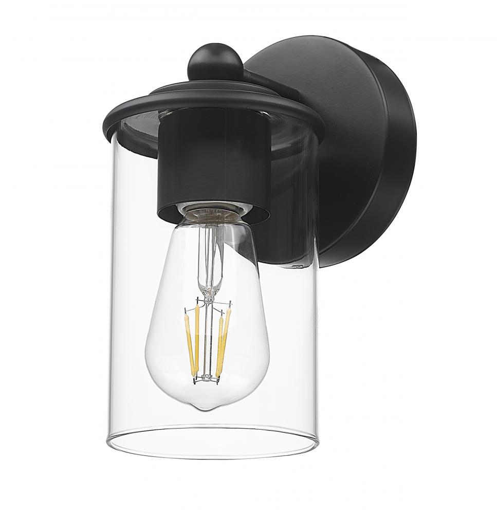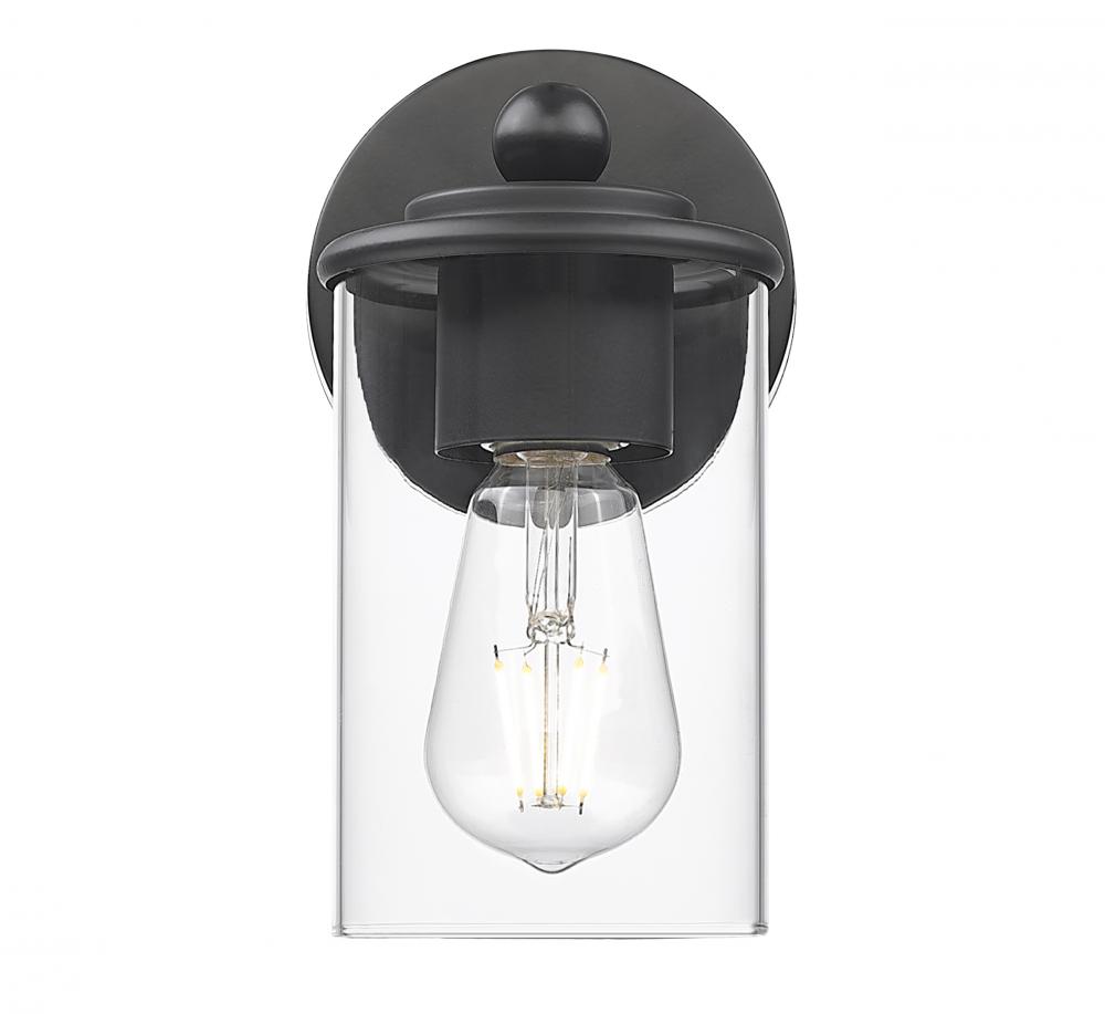 Brighten your vanity with the impeccable illumination and modern style of a contemporary one-light wall sconce. A cylinder of clear glass provides direct illumination, perfect for tasks and ambiance, while an eye-catching matte black finish frame adds decorative detail and depth in a modern bathroom or living area.