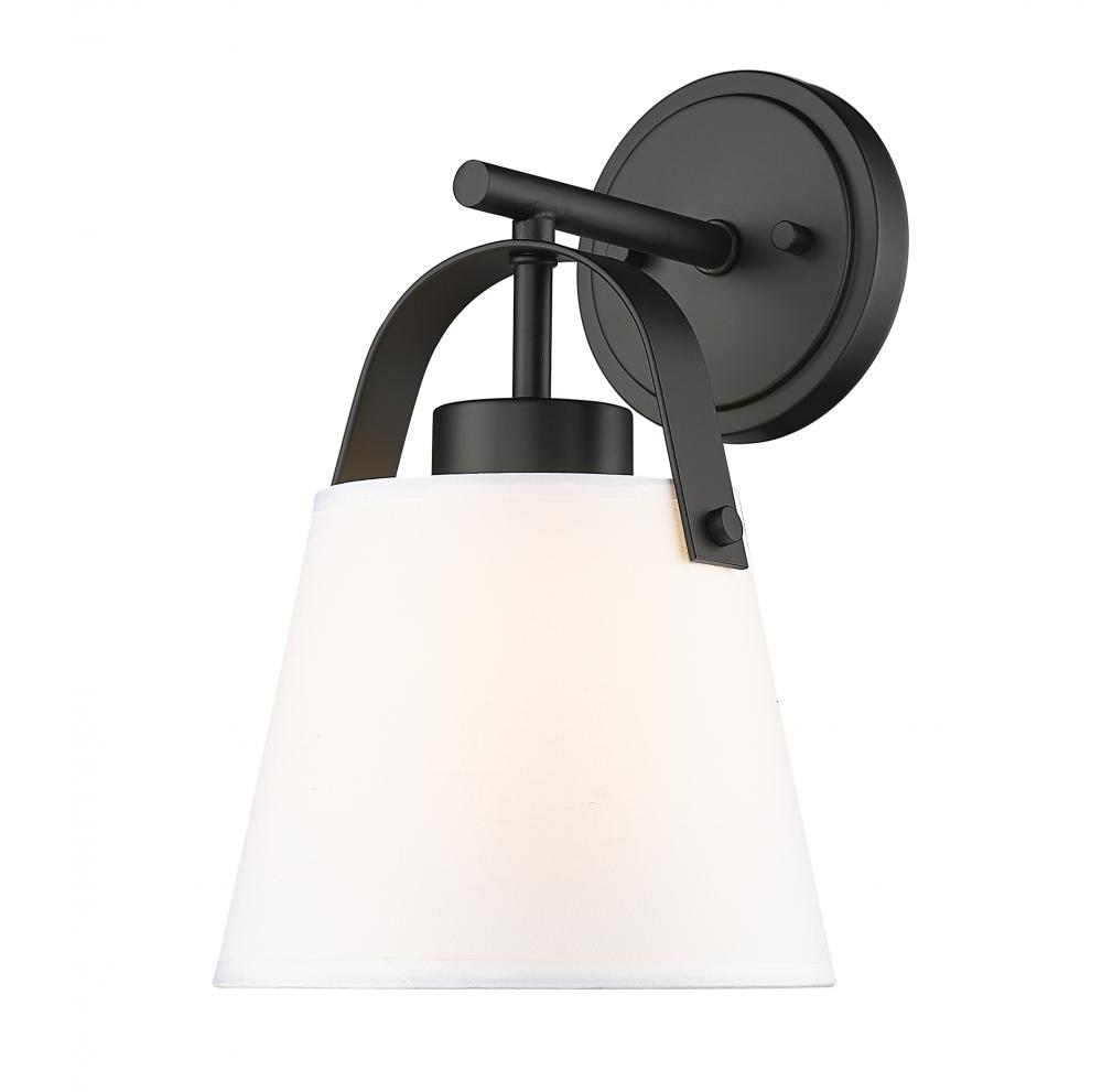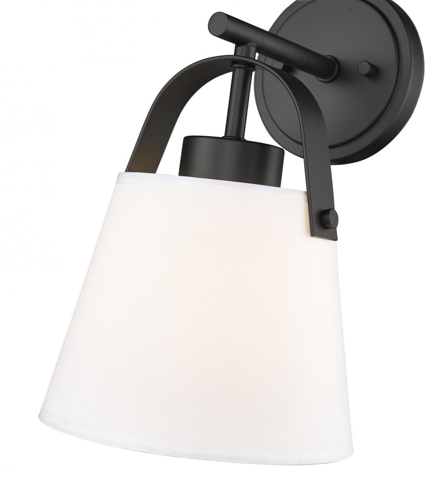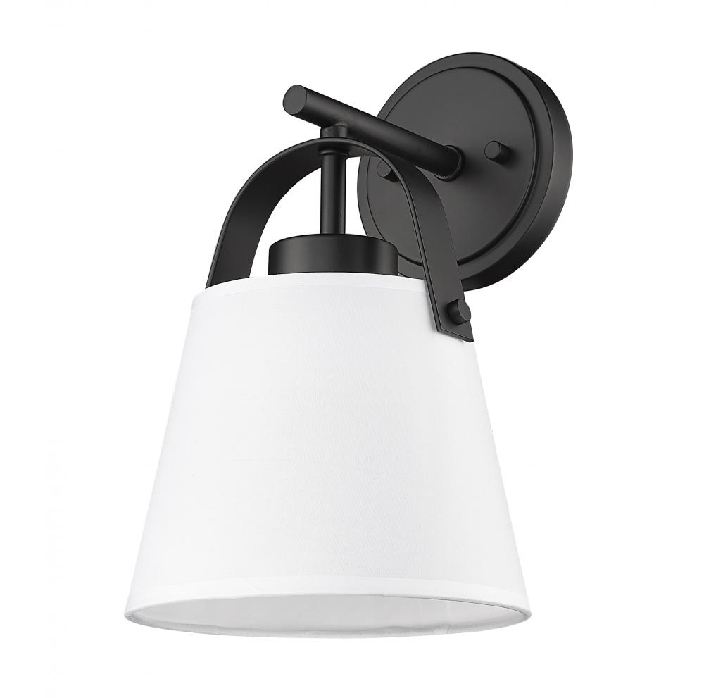 A contrasting finish reflects snappy style in a one-light wall light from the Z-Studio collection. This fixture is suited to a variety of settings including coastal, farmhouse, and casual, as it offers an open ivory fabric conical shade and ornate framing in bold matte black finish steel. Explore possibilities in a casual living space with a wall sconce that embellishes an easy, carefree living space.