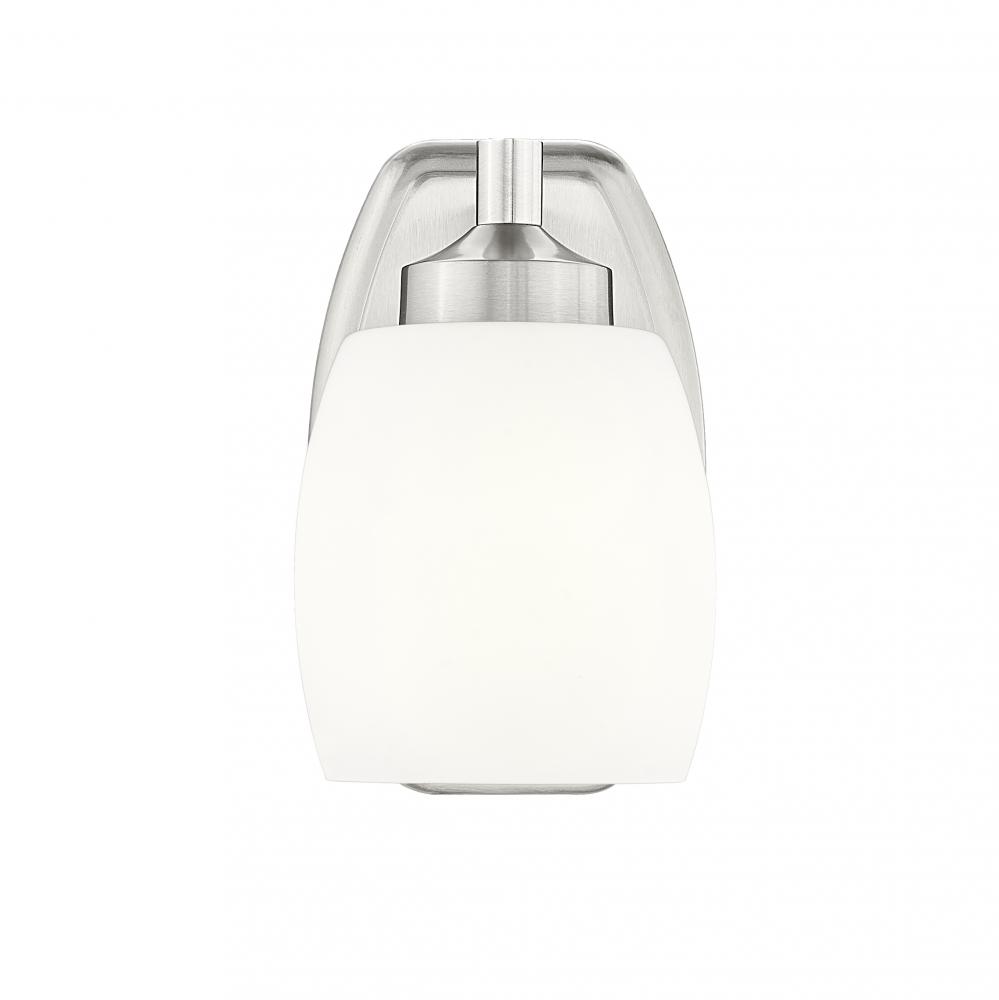 Gentle curvature adds interest and soft appeal to this modern one-light wall sconce from the Kendrick collection. Its restrained presence complements in industrial, mid-century and urban spaces, creating an inviting look and feel. Matte opal glass is chosen for its shade, gently diffusing illumination and adding soothing simplicity to a brushed nickel finish.