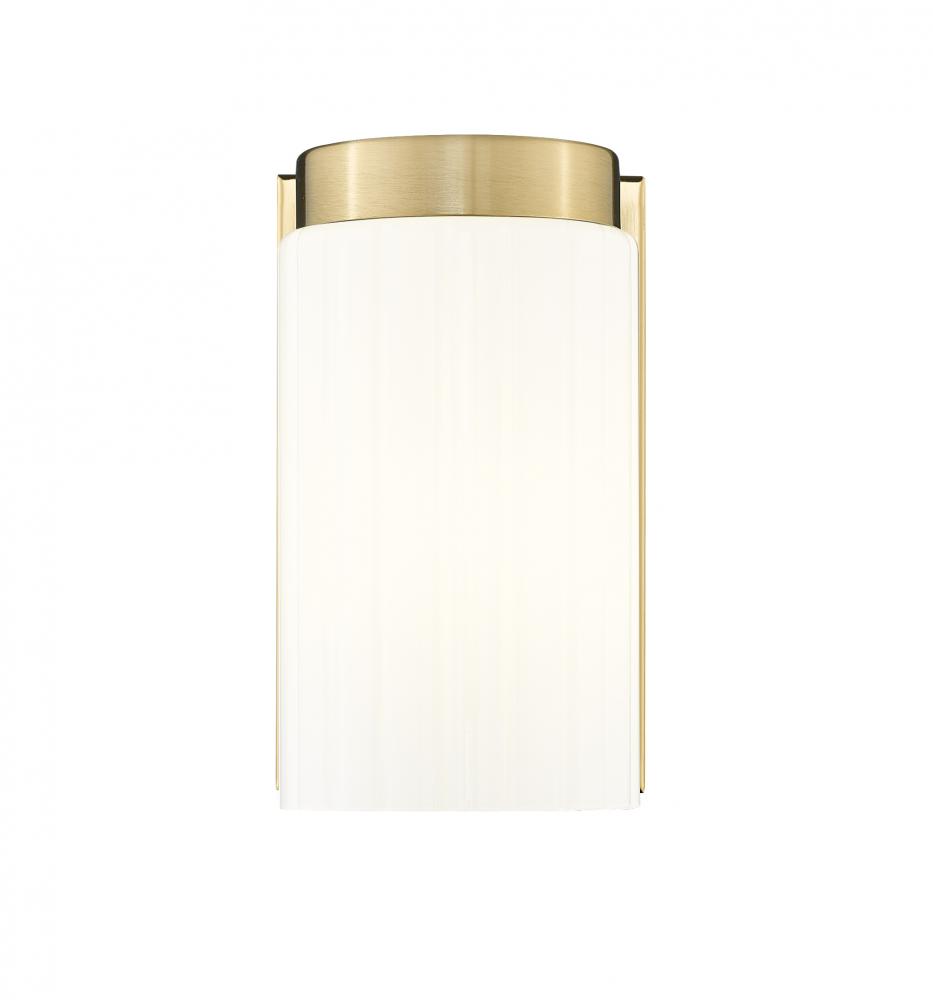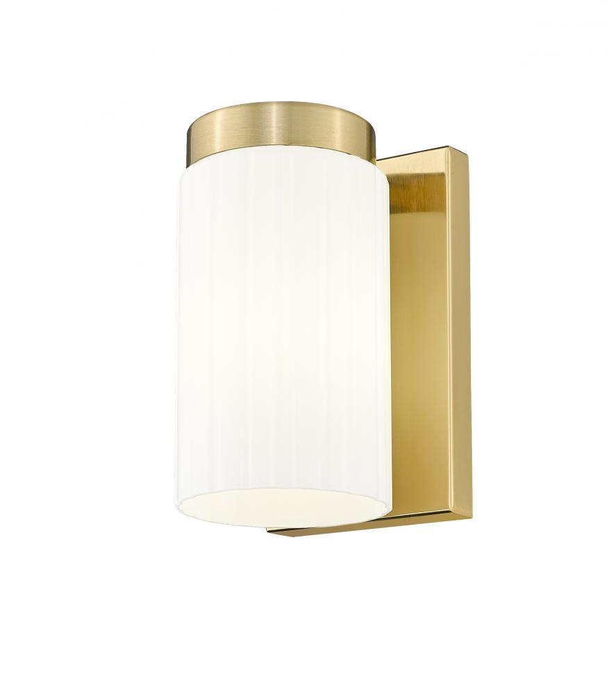 Luxe gold sets a sophisticated tone for a modern one-light wall sconce. Designed for simplicity and elegance of a silhouette, the fixture pairs a rectangular wall plate with a cylindrical shade, casting beautiful downlighting to create a welcoming ambiance in your entry, living area or bath.