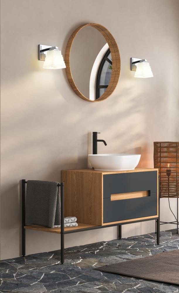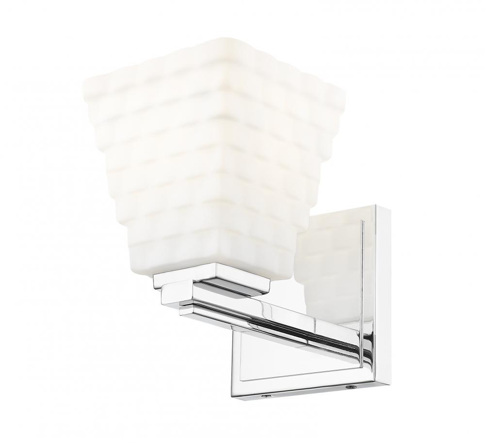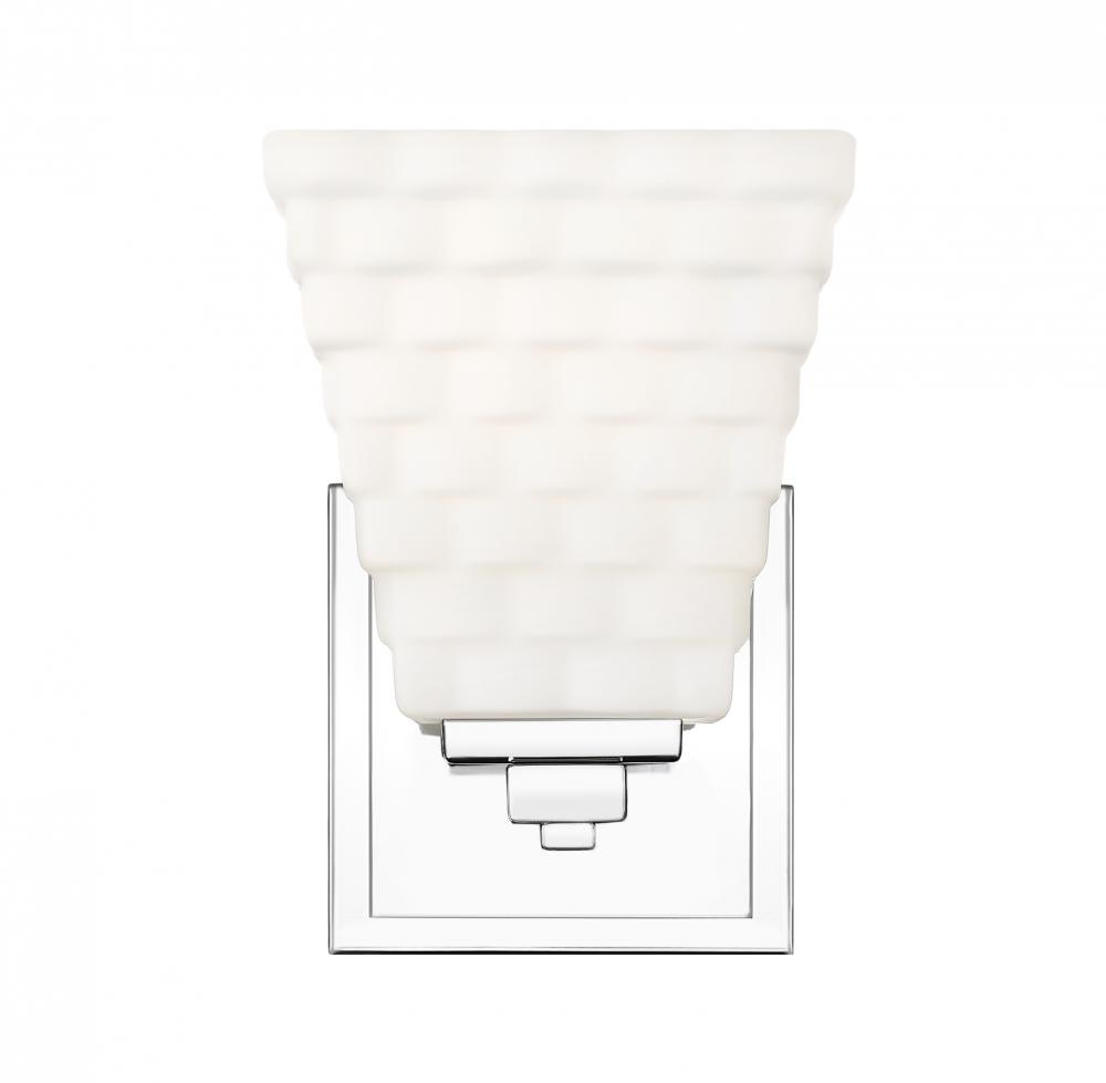 Gleaming chrome adds reflectivity to the stacked opal glass shade featured on this modern one-light wall sconce. Its a clean-lined presentation, creating a fresh look and feel that brims with texture. Its layered details enhance perfectly beside a bathroom vanity or in a dressing room.