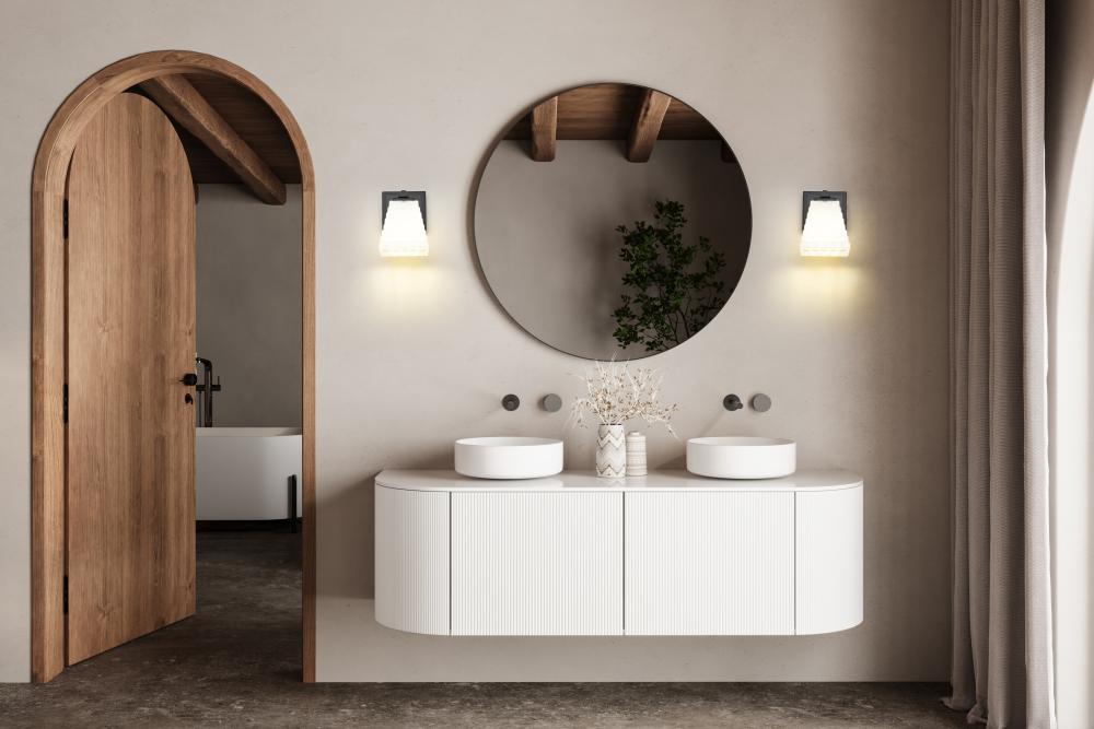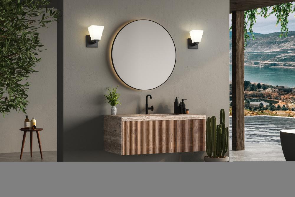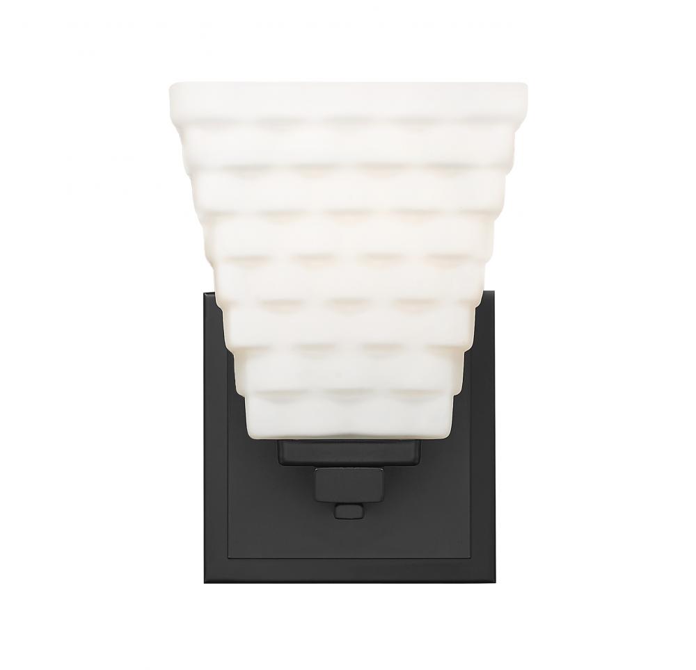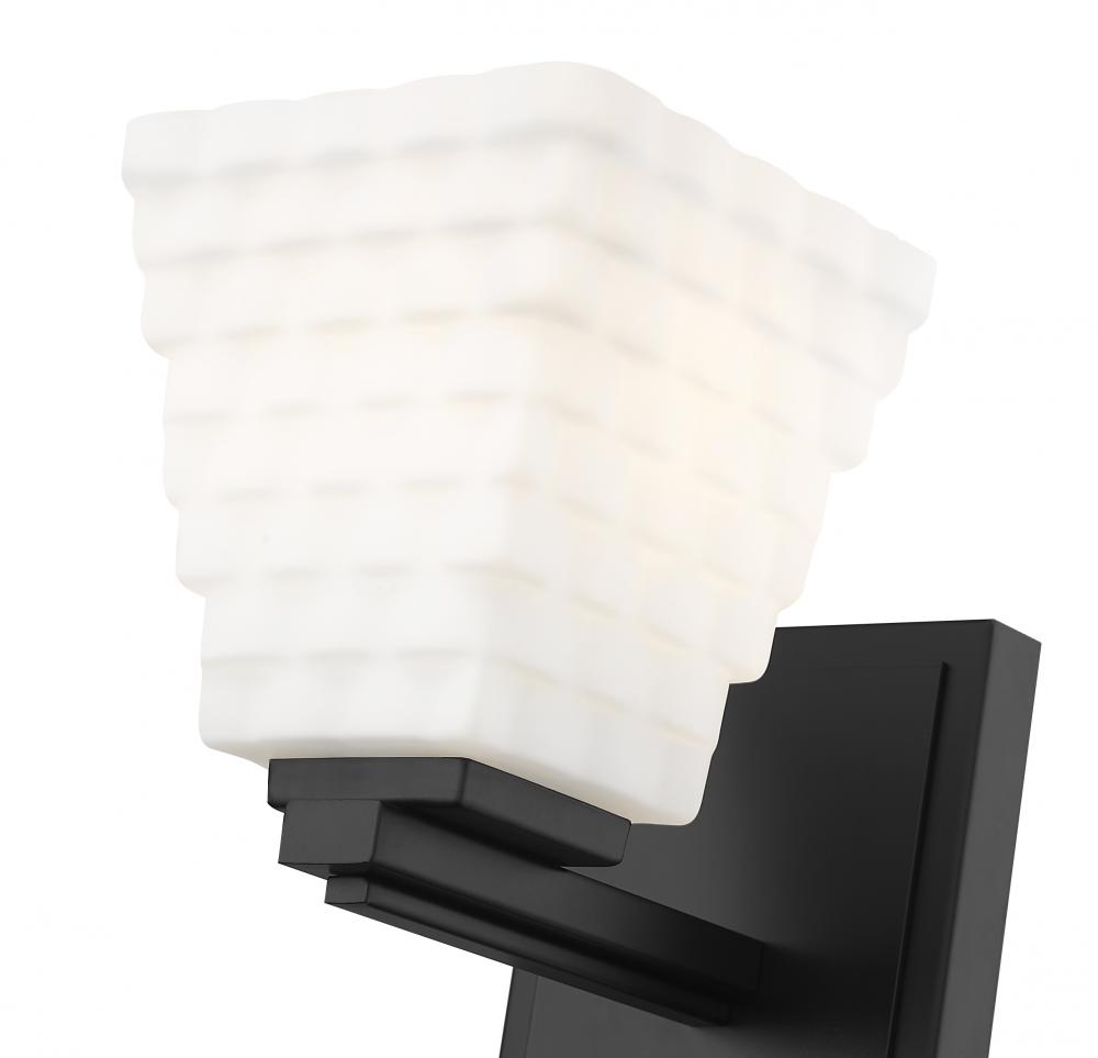 A square opal glass shade is crafted from layered rectangles, creating a refined, dimensional presentation for this modern one-light wall sconce. Its layered details continue on a simple arm and matte black plate, enhanced with a matte black finish that maximizes contrast and depth.