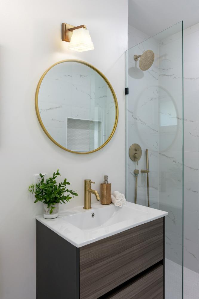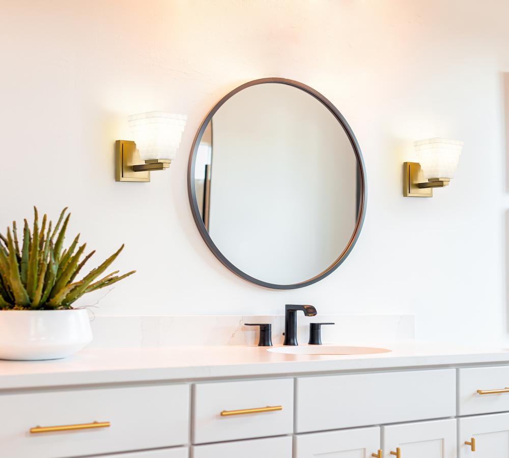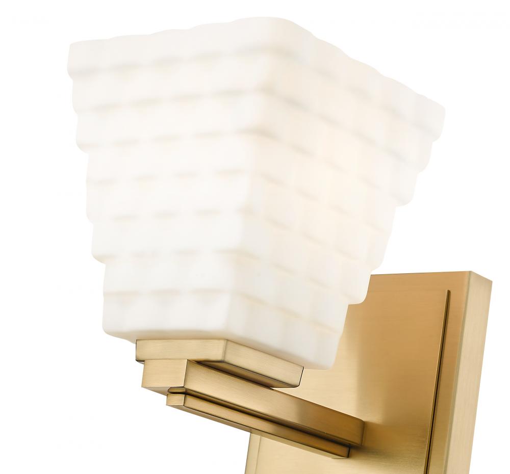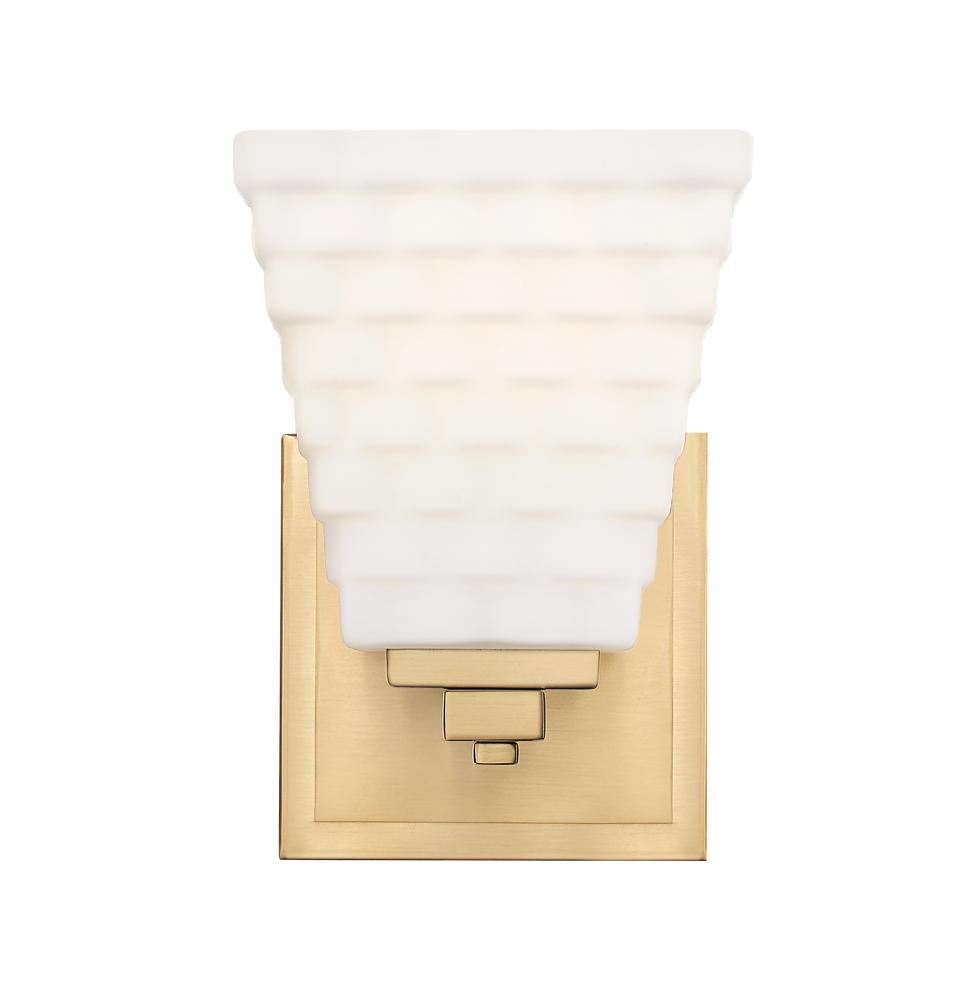 Infused with sophistication and understated elegance, this contemporary one-light wall sconce is a refined choice for a bathroom vanity or stylish bedroom. It features a layered back plate and arm, complete with a warm modern gold finish that brings inviting character. Its opal glass shade features layered rectangles that give the fixture a sense of artistry and character.