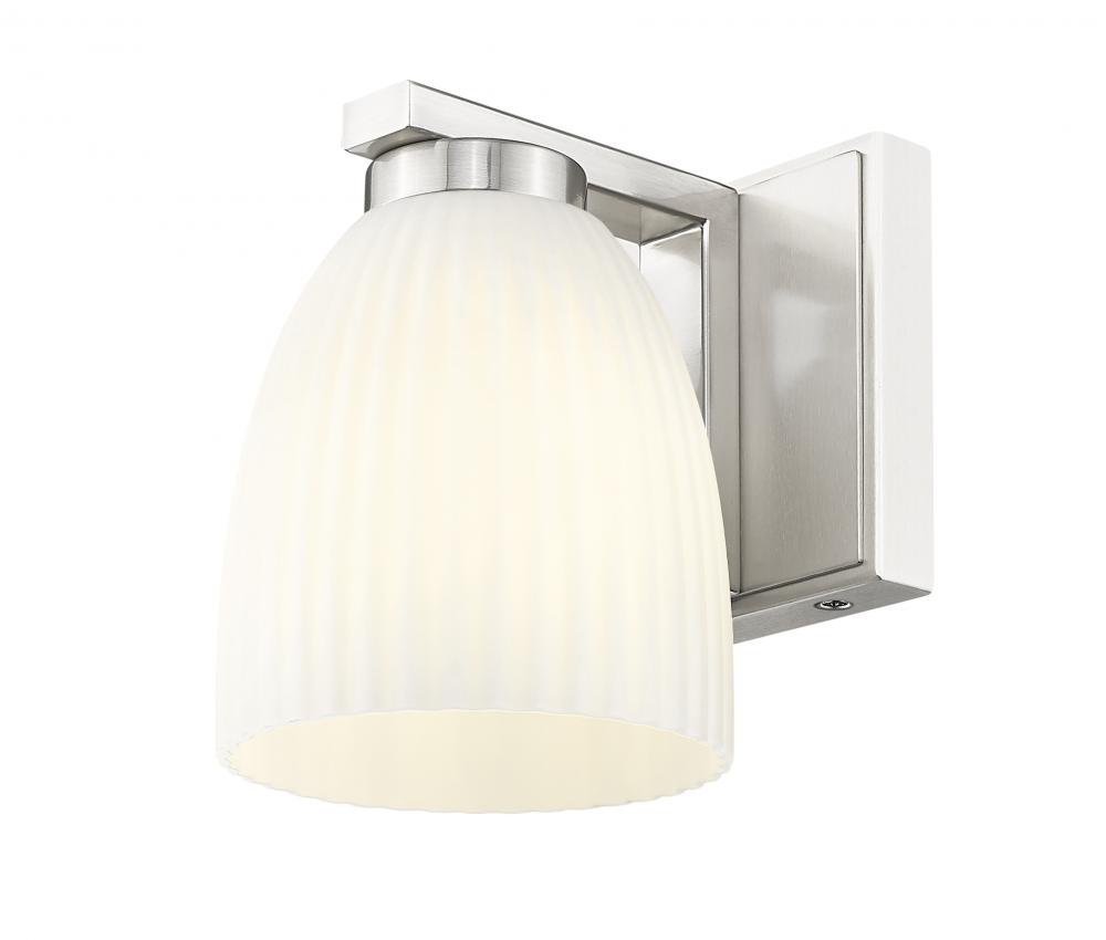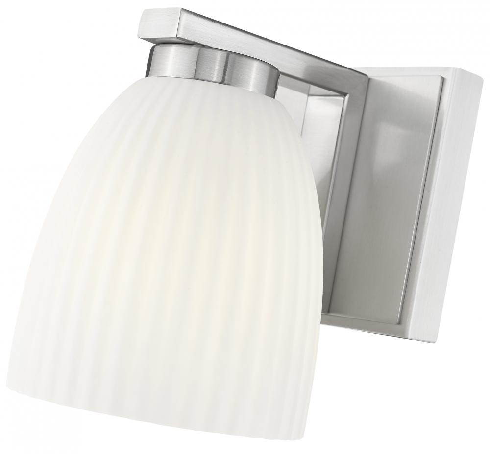 Sleek and subtle in a brushed nickel finish, this sconce pairs beautifully with matte opal glass to create soft, refined light. The ribbed texture elevates the glow, making it perfect for layering throughout a space. A quiet touch of elegance for hallways, baths, or bedrooms.
