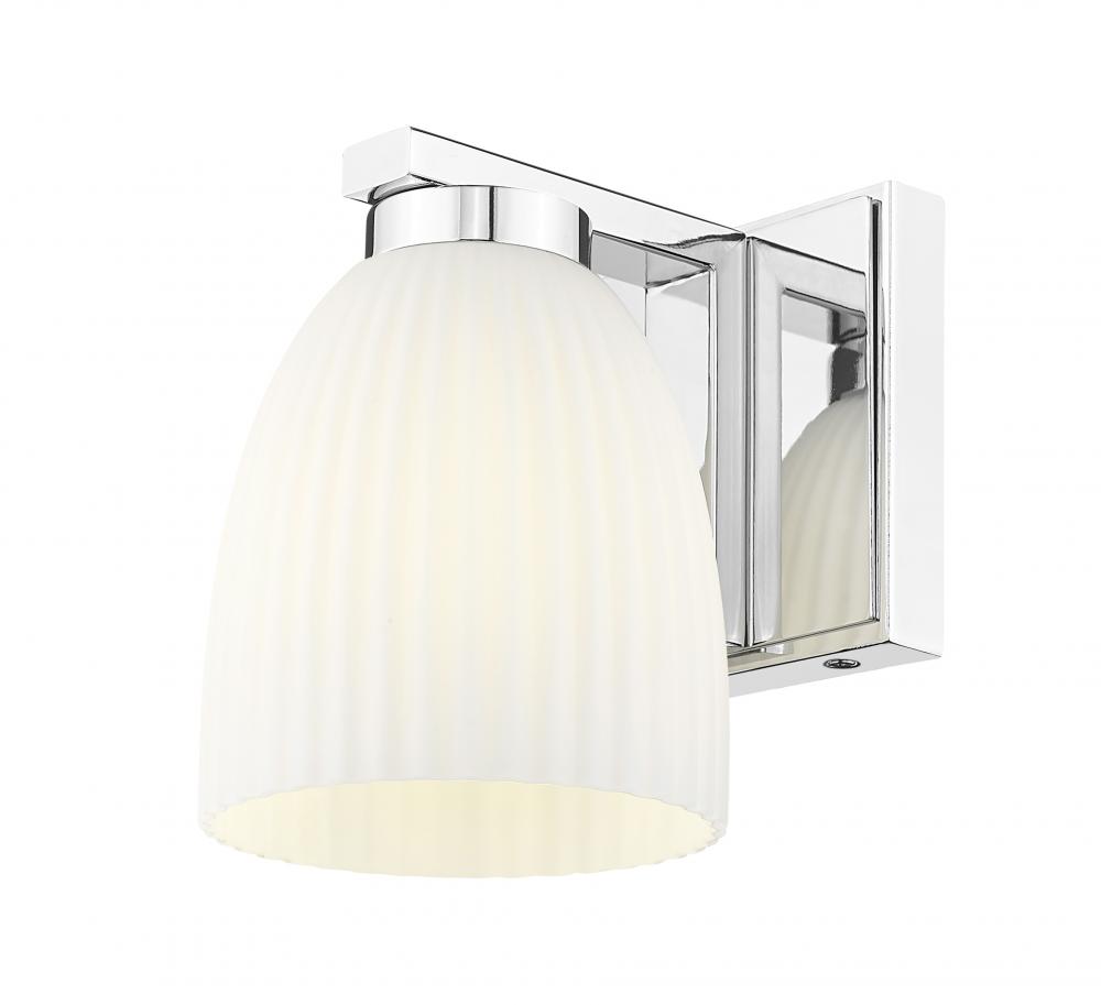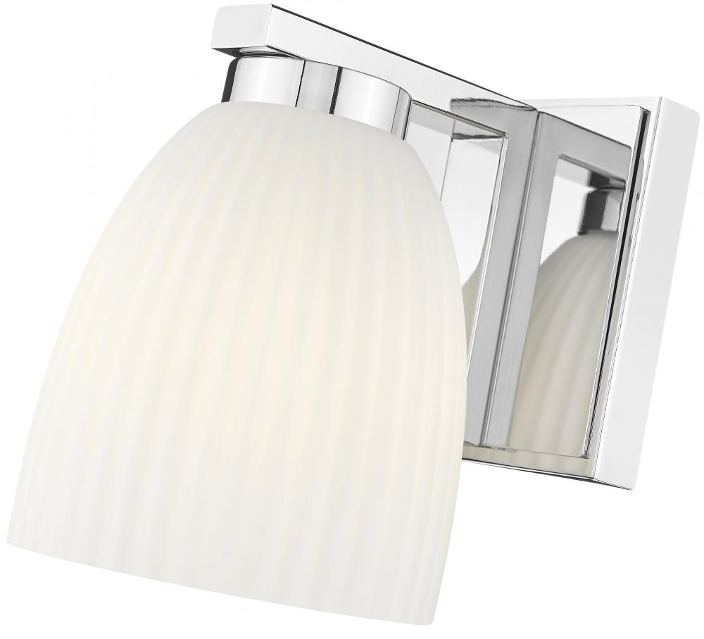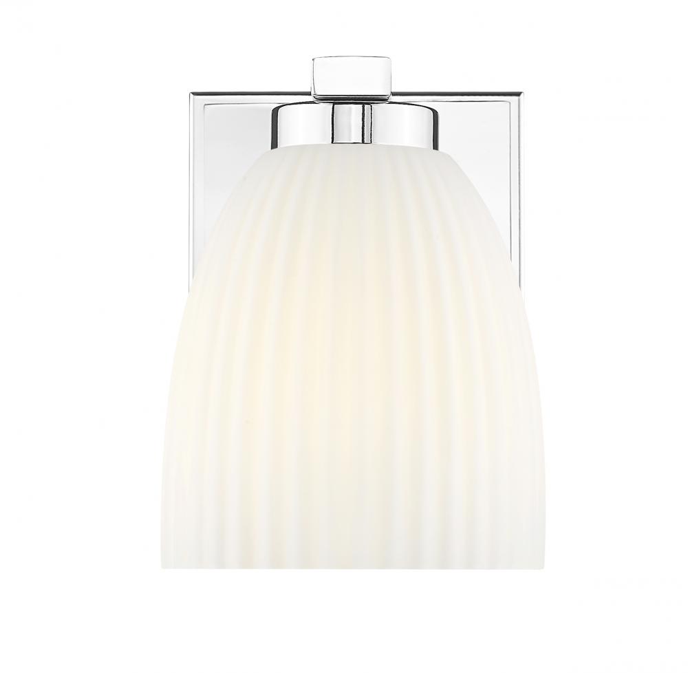 A polished chrome finish and matte opal glass come together to deliver crisp, radiant style. The ribbed opal shade diffuses light with a gentle glow that flatters any wall. This piece is perfect as a solo accent or paired for symmetrical brilliance.
