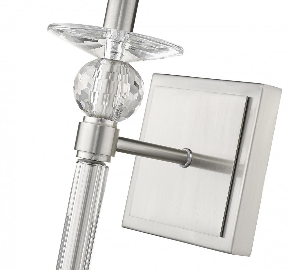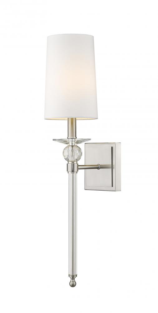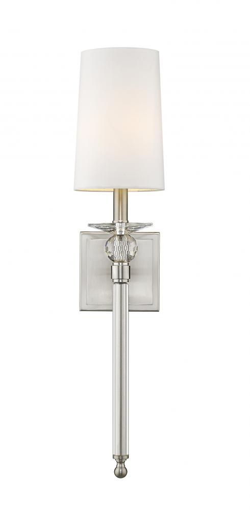 Capture the upscale elegance of a wall-mounted fixture that delivers ambient lighting as it updates the look of a bathroom, bedroom, or hallway. Made from brushed nickel finish steel and crystal, and topped with a sleek white fabric shade, this one-light wall sconce embellishes a classic design scheme with a traditional lamp motif and artistic crystal accents.