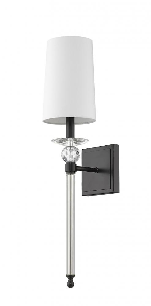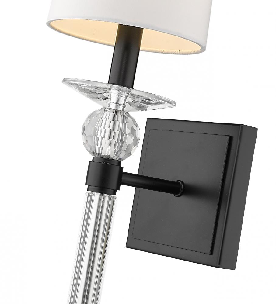 Capture the upscale elegance of a wall-mounted fixture that delivers ambient lighting as it updates the look of a bathroom, bedroom, or hallway. Made from matte black finish steel and crystal, and topped with a sleek white fabric shade, this one-light wall sconce embellishes a classic design scheme with a traditional lamp motif and artistic crystal accents.