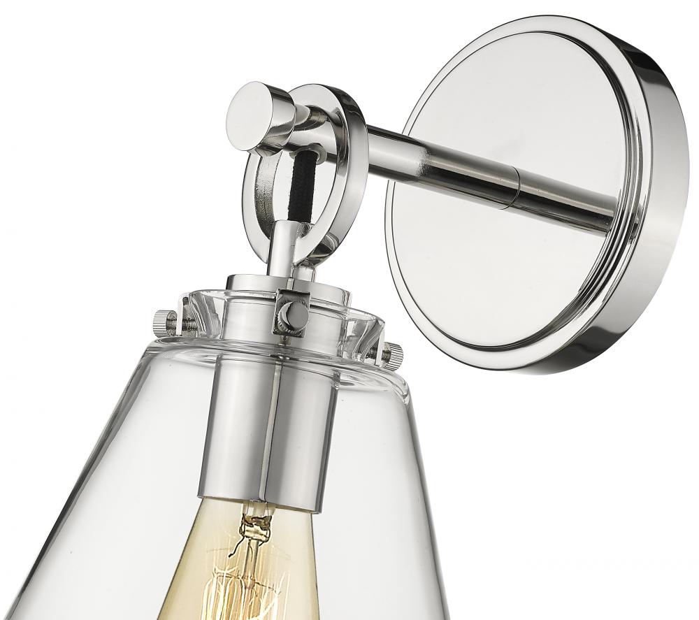 This contemporary one-light wall sconce devotes attention to detail as it delivers fresh, inspiring materials. Make a modern bathroom, bedroom, or hallway come to life with a fixture featuring polished nickel finish steel and a conical clear glass shade.