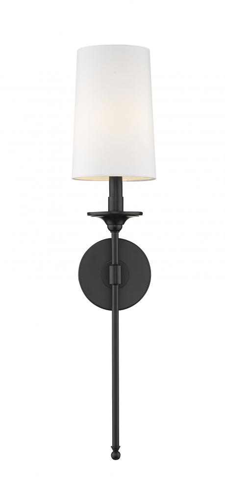 The bold look of matte black finish steel stands out in the design of this one-light wall sconce, an ideal selection to enhance a modern or transitional bathroom, bedroom, or hallway. Refined detailing pairs a matte black finish wall mount and stem with a fresh white fabric shade, creating a classic look that offers mood-inspiring ambient lighting.
