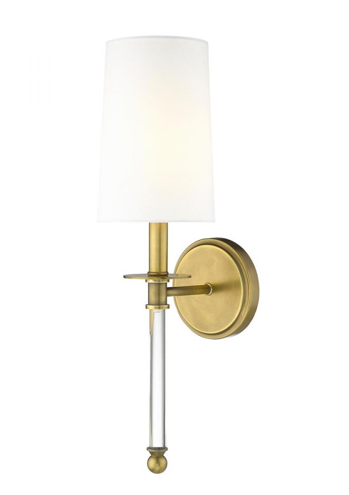 Graceful modern design creates a lift for contemporary bathrooms, bedrooms, and hallways with this elegant one-light wall sconce. Indulge in an artistic linear silhouette blending rubbed brass finish steel with delicate crystal, forming an enticing vertical stem. A fresh white fabric shade seals the classic look of this sconce, a perfect solution for a challenge of extra lighting.