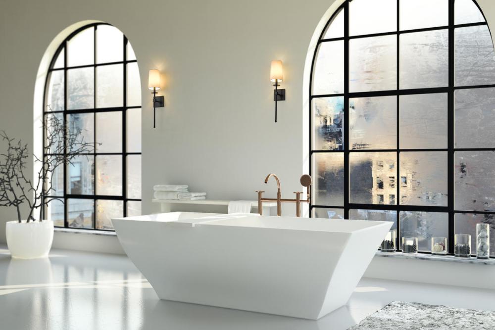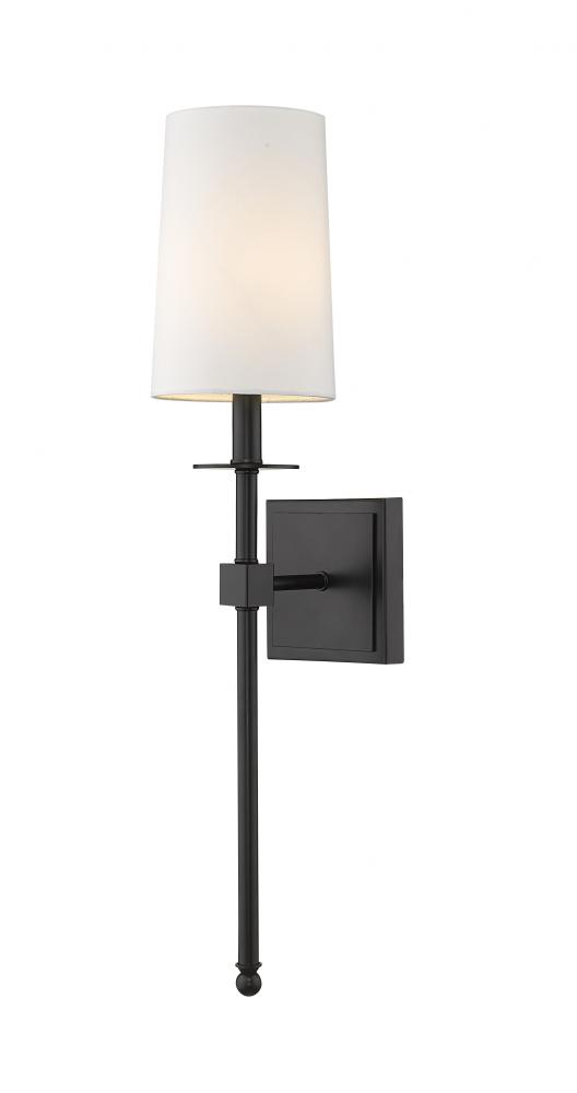 Long lines and an elegantly simple motif lend sophistication to this contemporary matte black finish one-light wall sconce. Mirroring a traditional lamp motif, its steel frame and wall mount join a tall white fabric shade to form a decadent look with versatility for use in a bathroom, bedroom, or hallway.