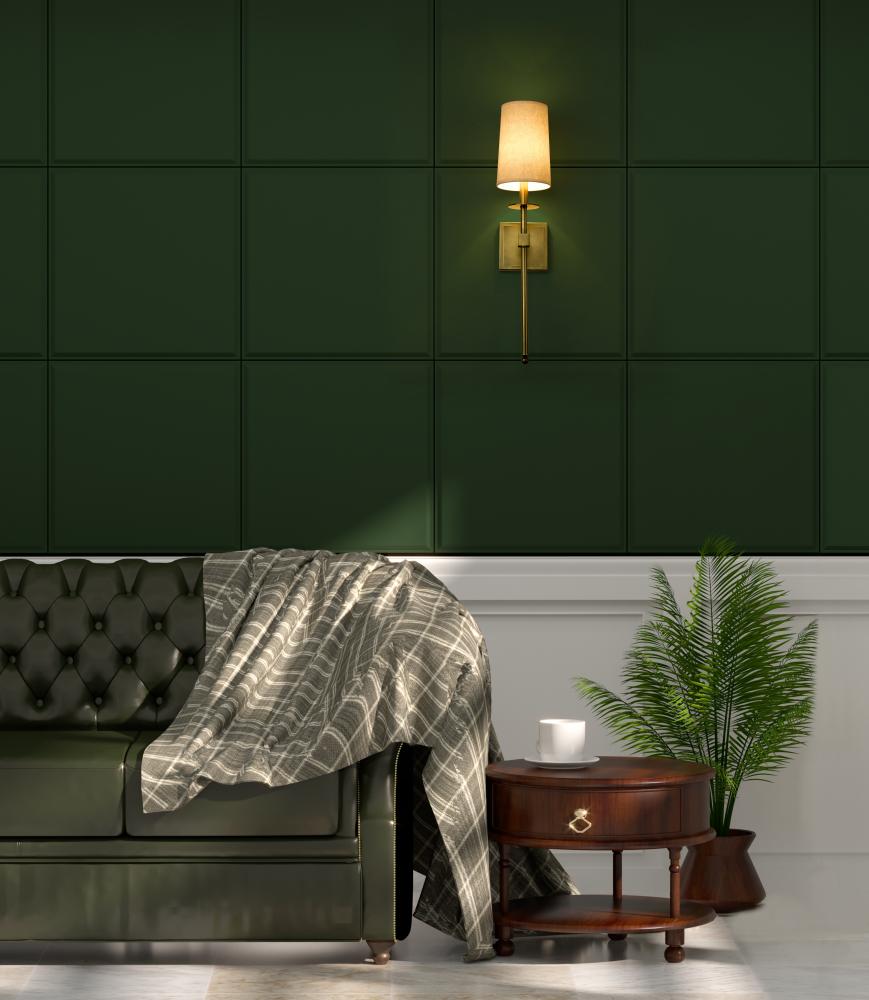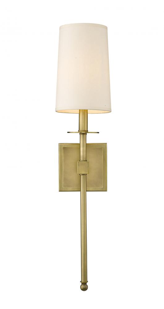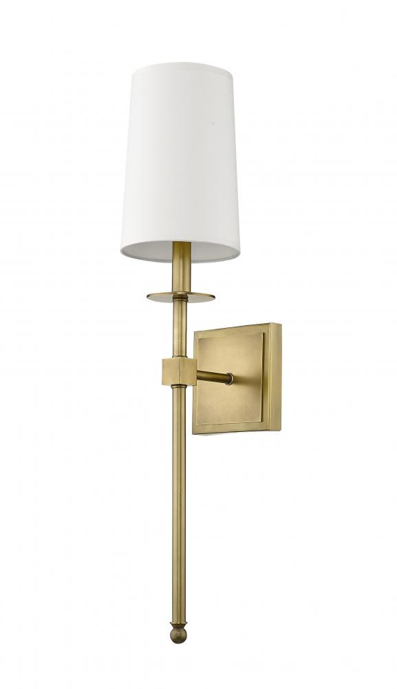 Long lines and an elegantly simple motif lend sophistication to this contemporary rubbed brass finish one-light wall sconce. Mirroring a traditional lamp motif, its steel frame and wall mount join a tall white fabric shade to form a decadent look with versatility for use in a bathroom, bedroom, or hallway.