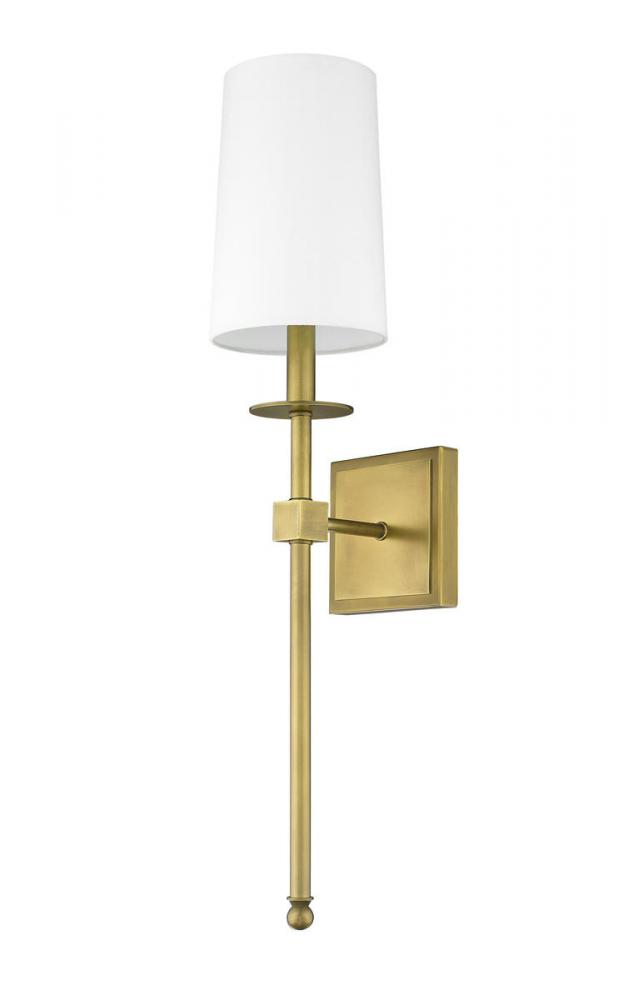 Long lines and an elegantly simple motif lend sophistication to this contemporary rubbed brass finish one-light wall sconce. Mirroring a traditional lamp motif, its steel frame and wall mount join a tall white fabric shade to form a decadent look with versatility for use in a bathroom, bedroom, or hallway.