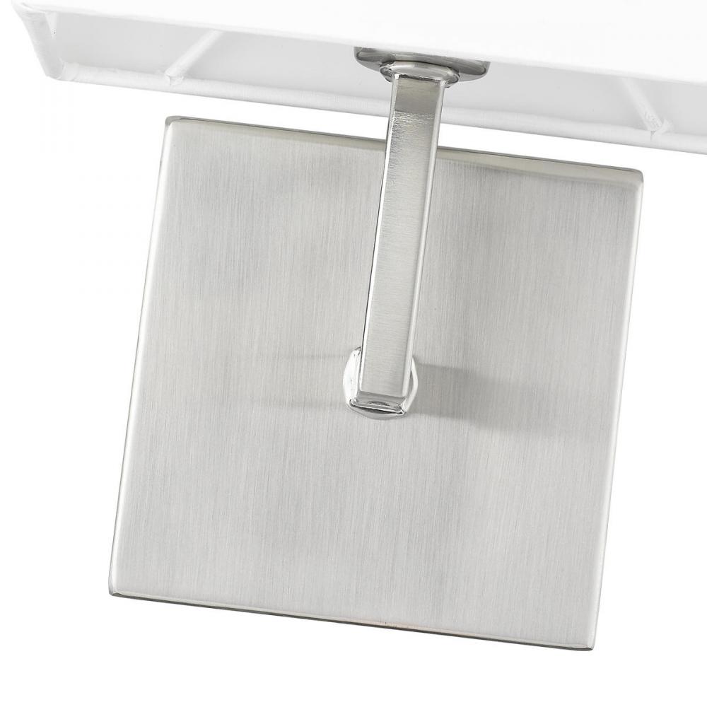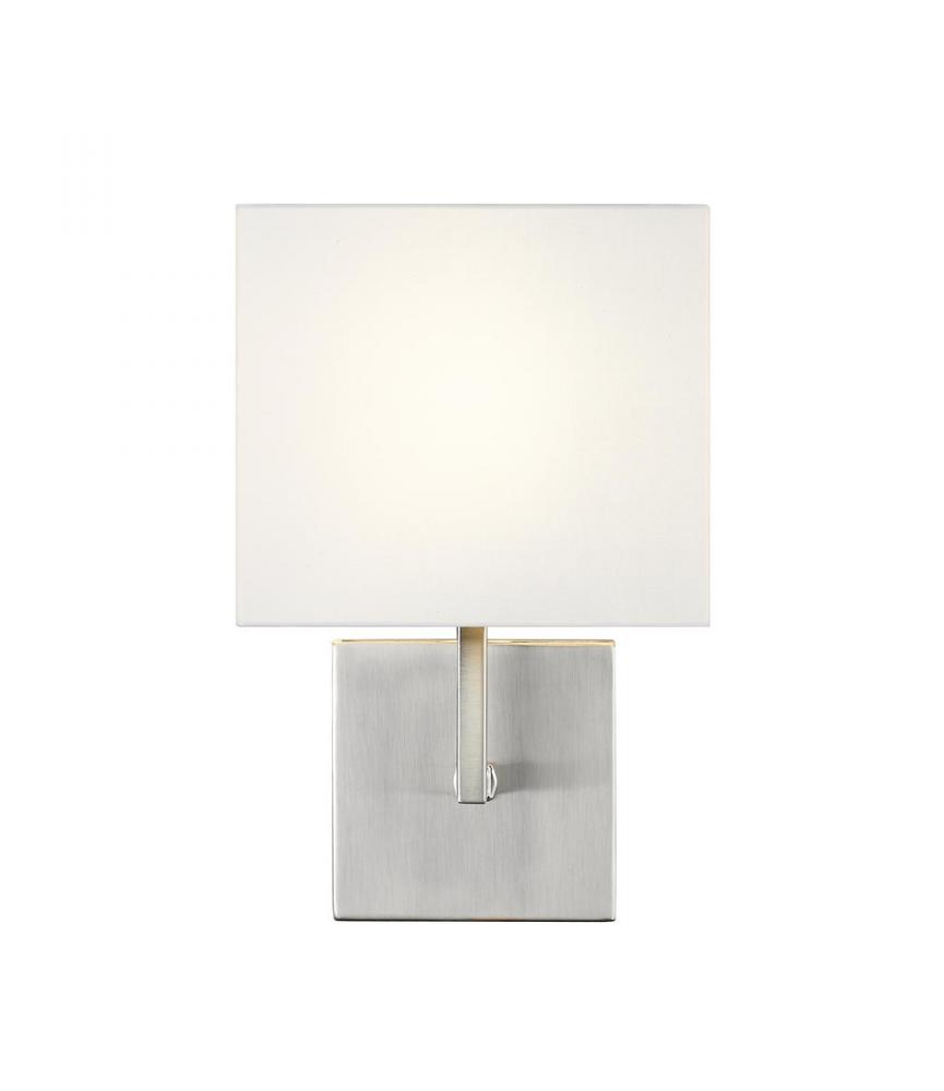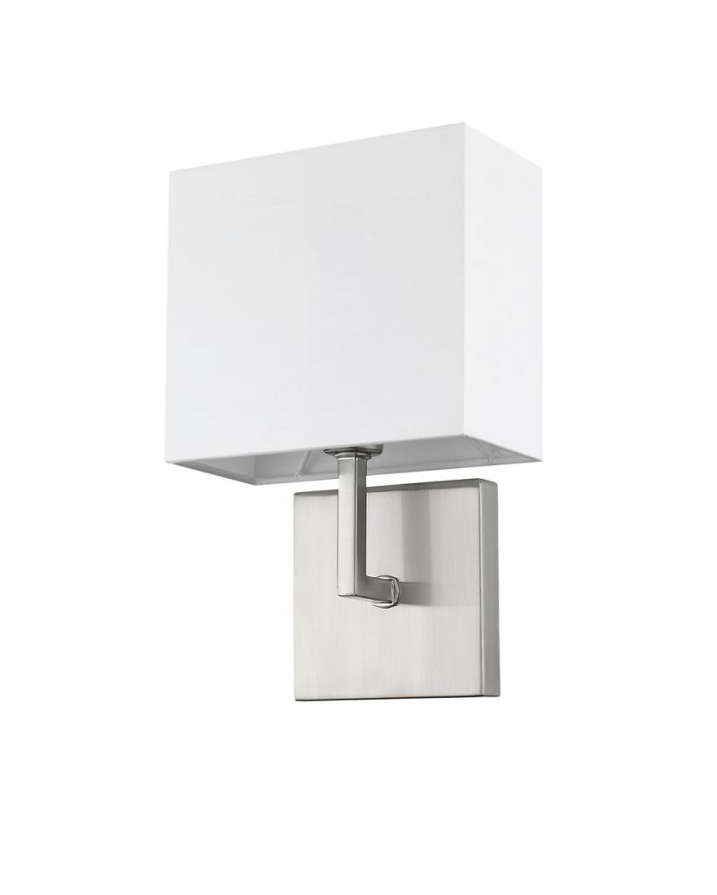 Add a spirited contemporary look with light style, choosing this one-light metal sconce to infuse targeted lighting in a modern bath or living space. This light from the Saxon collection features a clean silhouette with a backplate and arm made of brushed nickel finish steel and a box shade wrapped in crisp white fabric.