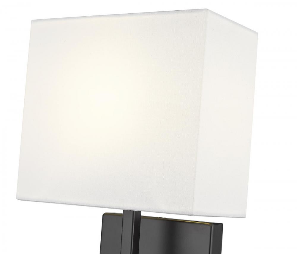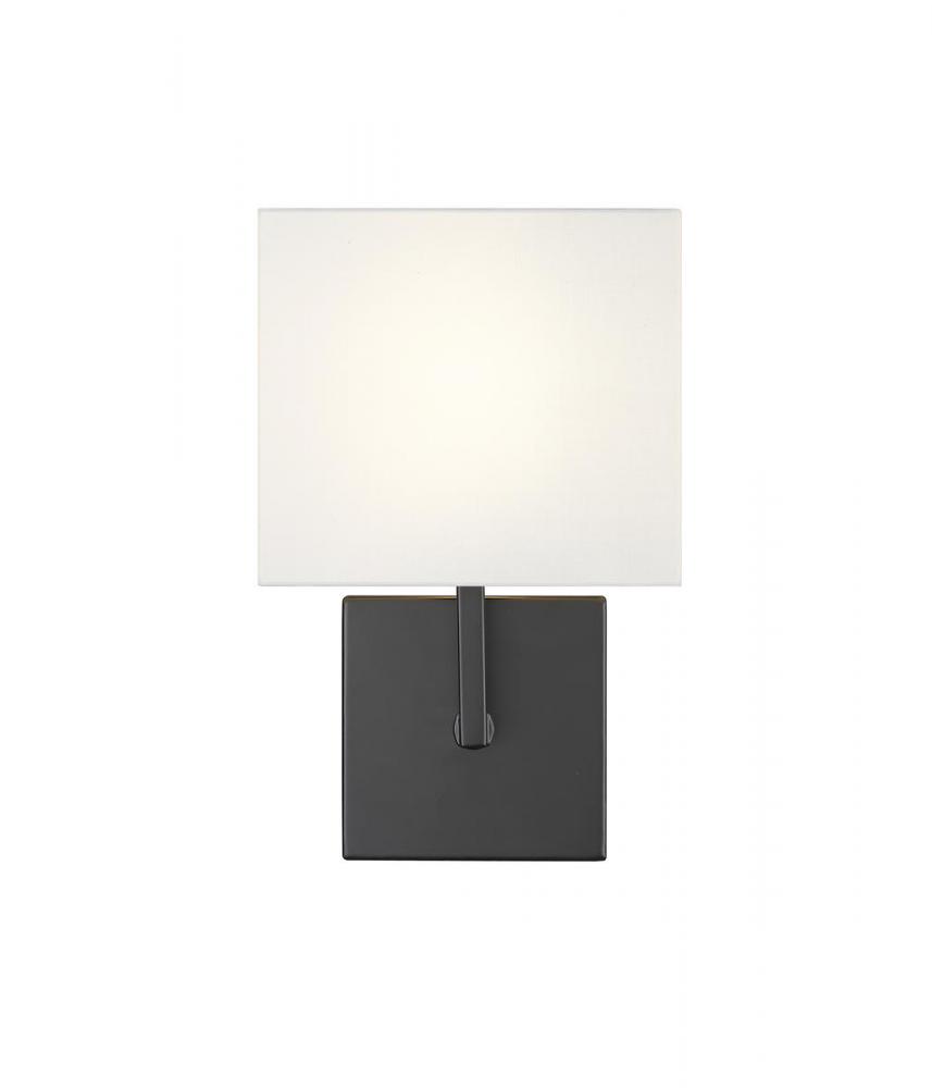 Add a spirited contemporary look with light style, choosing this one-light metal sconce to infuse targeted lighting in a modern bath or living space. This light from the Saxon collection features a clean silhouette with a backplate and arm made of matte black finish steel and a box shade wrapped in crisp white fabric.