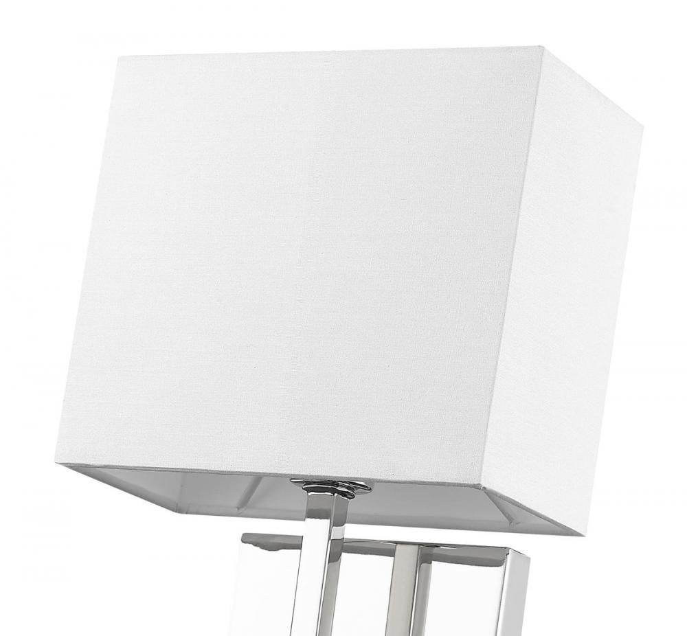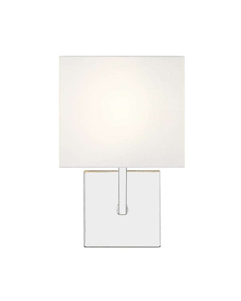 Add a spirited contemporary look with light style, choosing this one-light metal sconce to infuse targeted lighting in a modern bath or living space. This light from the Saxon collection features a clean silhouette with a backplate and arm made of brilliant polished nickel finish steel and a box shade wrapped in crisp white fabric.