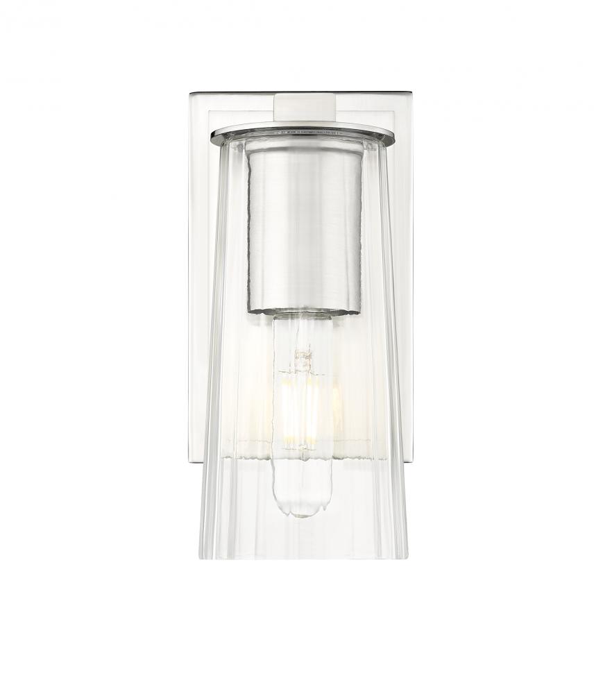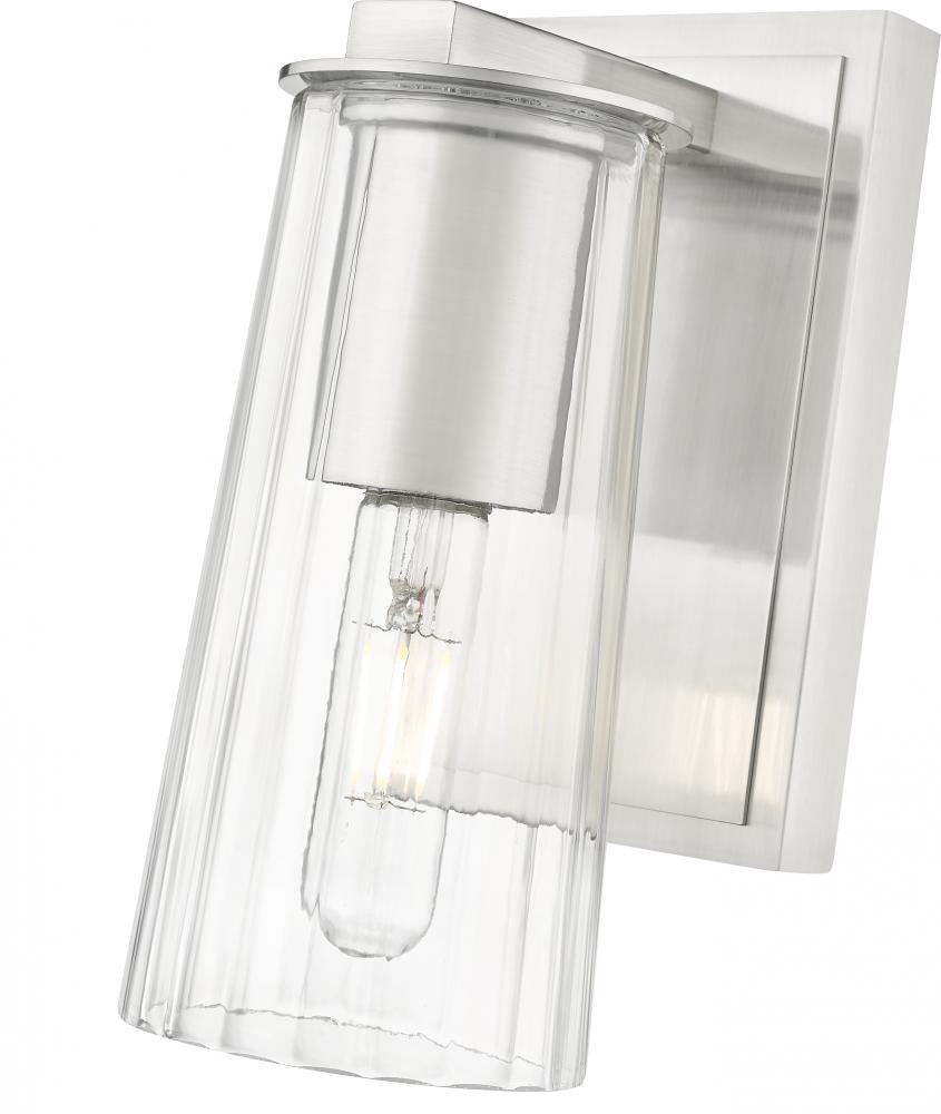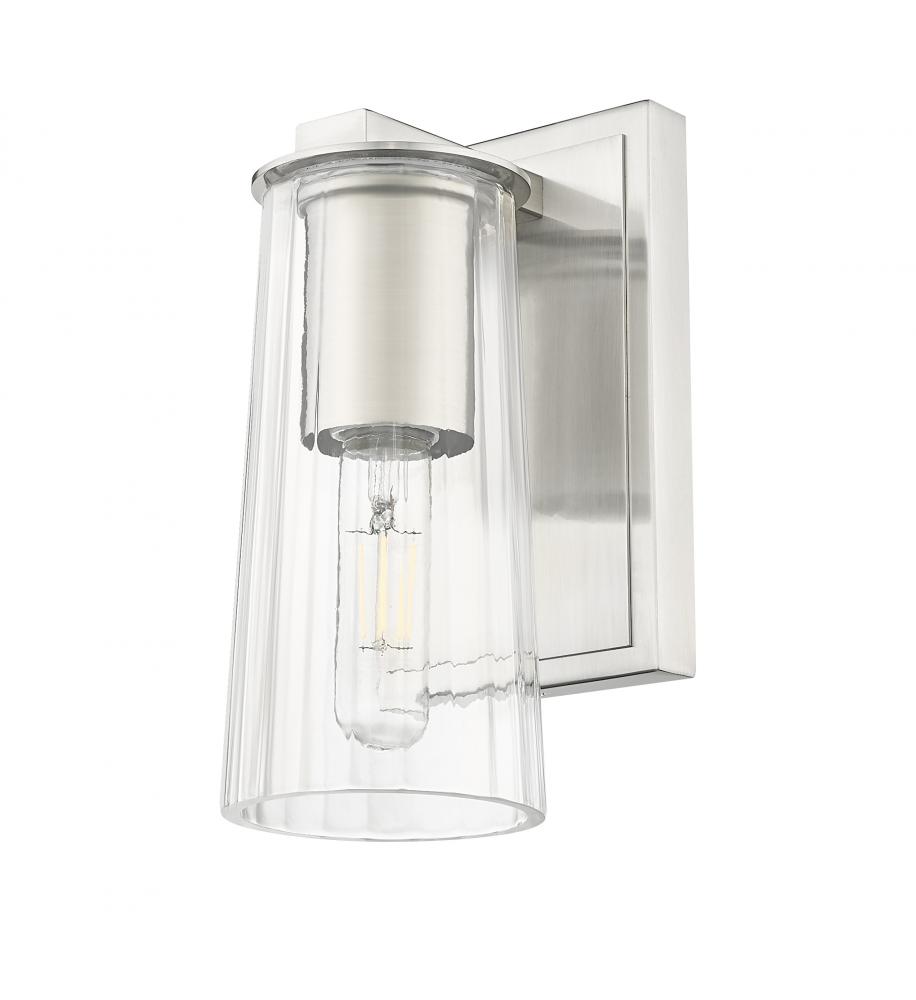 Charm meets versatility in an industrial one-light wall sconce with plenty of personality. A tubular bulb is tucked in a clear tapering glass shade, casting beautiful illumination in a living area, bath, or bedroom. A brushed nickel finish complements the wall plate and hardware of this eye-catching fixture, perfect for myriad spaces and existing decor motifs.