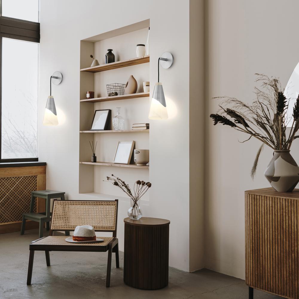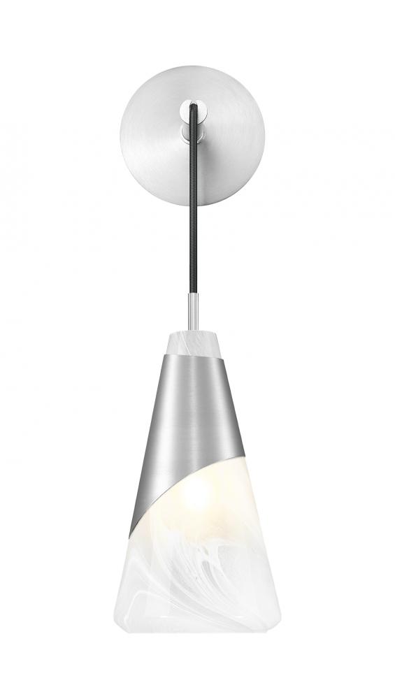 Swirls in artisan glass bring icy elegance to this modern one-light wall sconce. A metal shroud lends sleek style with a brushed nickel finish, and ensures softly diffused light from a sconce that elevates your bath, entry, or living area.