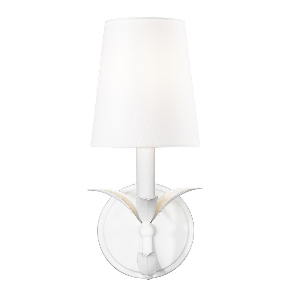 With a softly textured white finish steel frame, this one-light wall sconce could not be more artisan and earthy at the same time. We love the delicate fronds simulating botanicals, making its curved arm an example of chic style. A candelabra bulb base weaves romance into a dimmable light fixture complementing bedrooms, living rooms, and hallways.