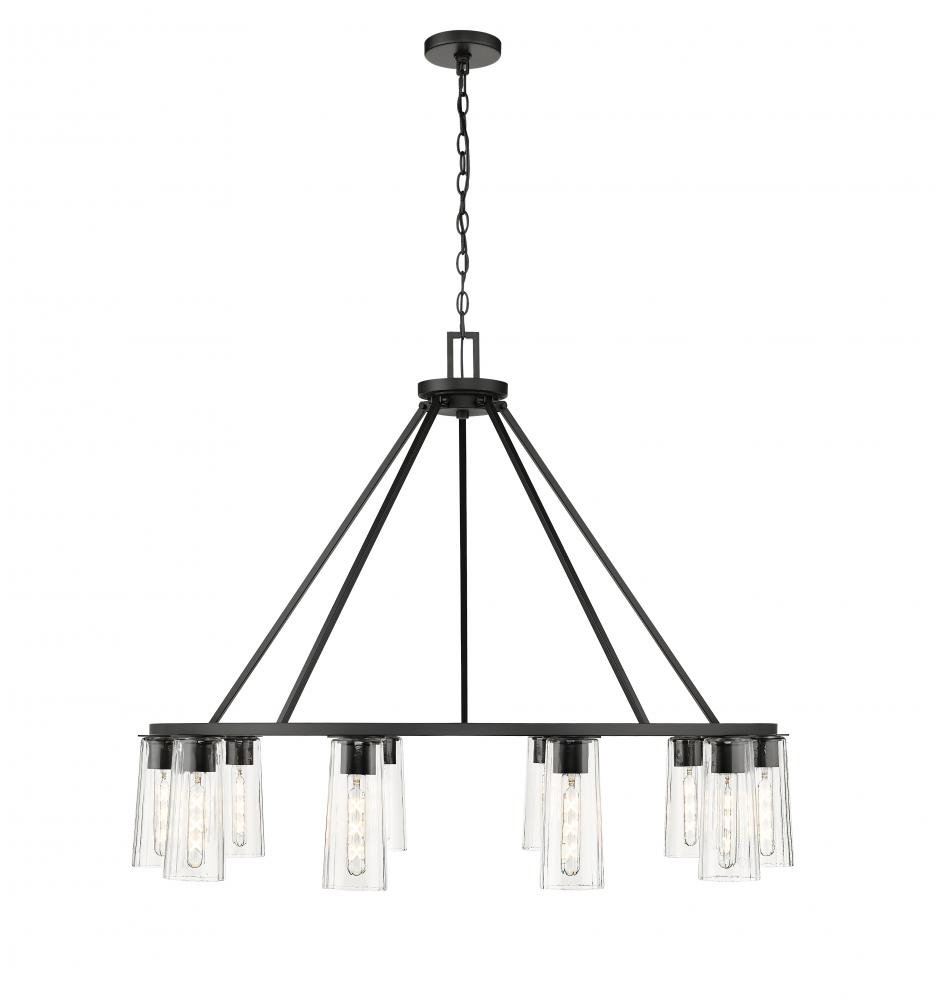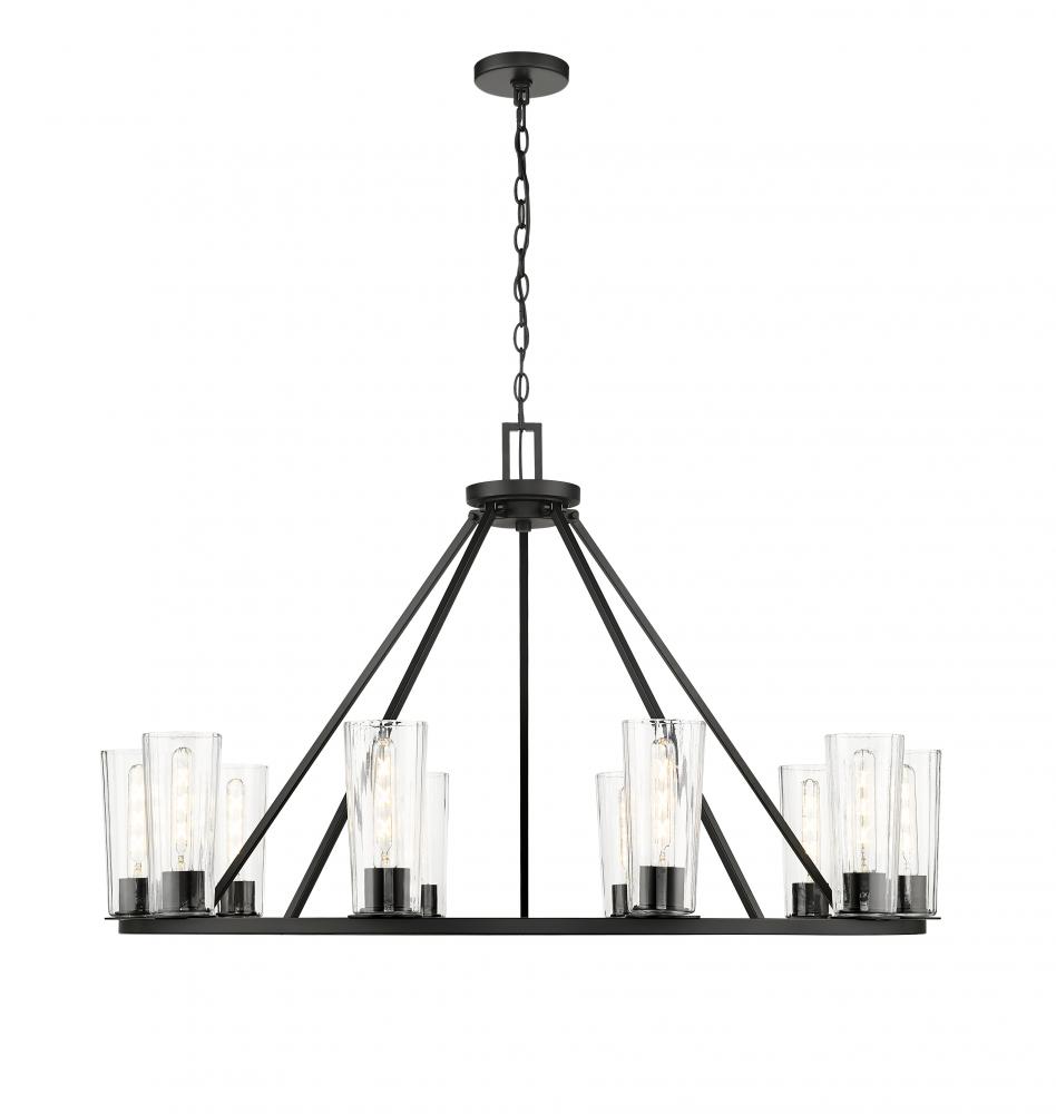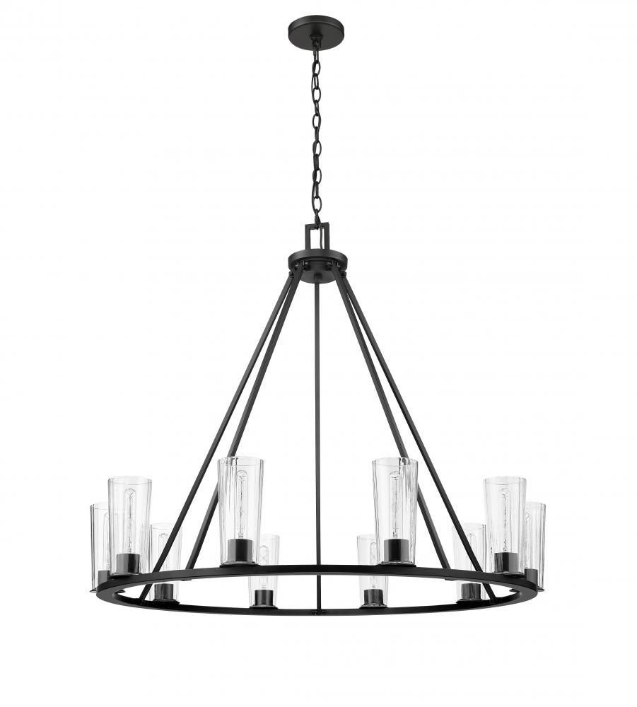 Gorgeous tubular bulbs pair with tapered glass shades to create exceptional illumination and style for a bold ten-light chandelier. A classic ring frame hosts its charming lights, with a conical silhouette created with down rods and chain link suspension. A matte black frame finish creates texture and depth for this superb fixture.