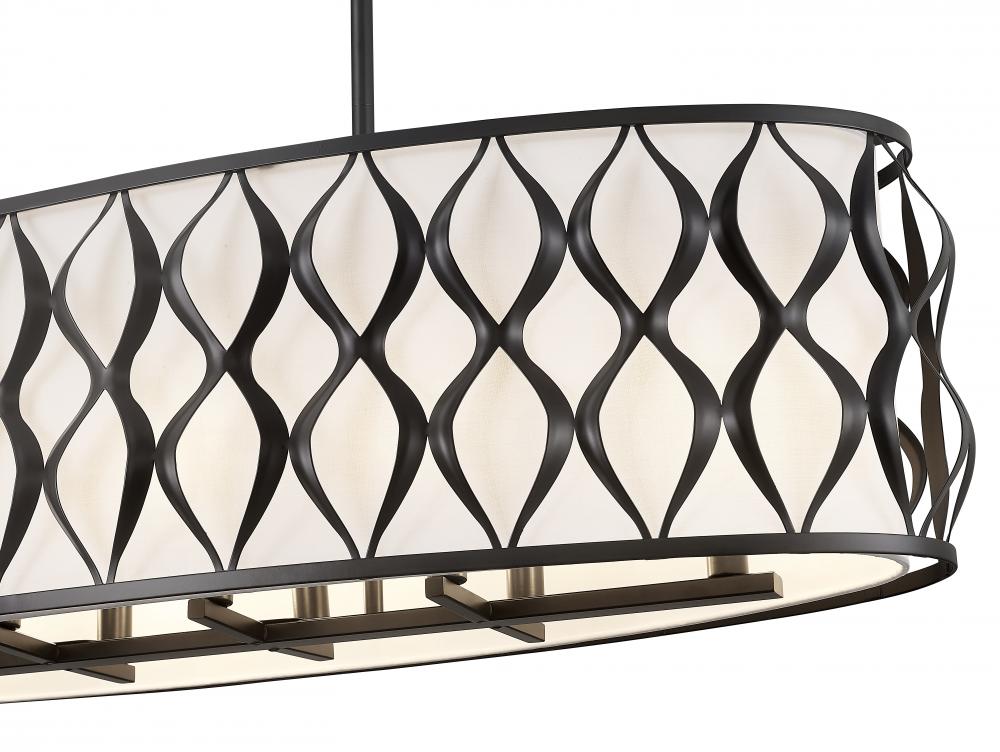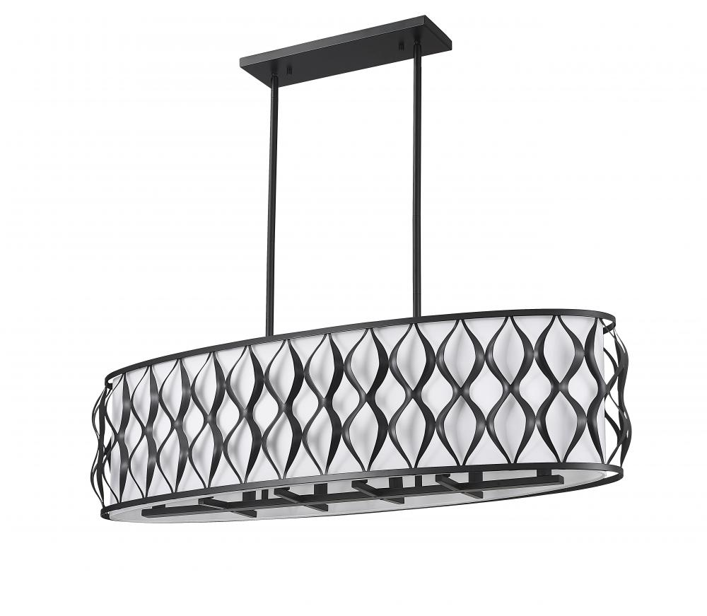 Classic styling delivers both modern industrial and transitional elegance to any space as this ten-light linear chandelier makes an artisan impact over kitchen islands, dining spaces, and billiards rooms. With a wavy ribbon pattern on its matte black finish steel frame and a white fabric diffuser, this stylish fixture maintains palette simplicity and offers a versatile look. Candelabra lights are gently filtered to manage glare levels, emitting an optical glow that?s easy on the eyes.