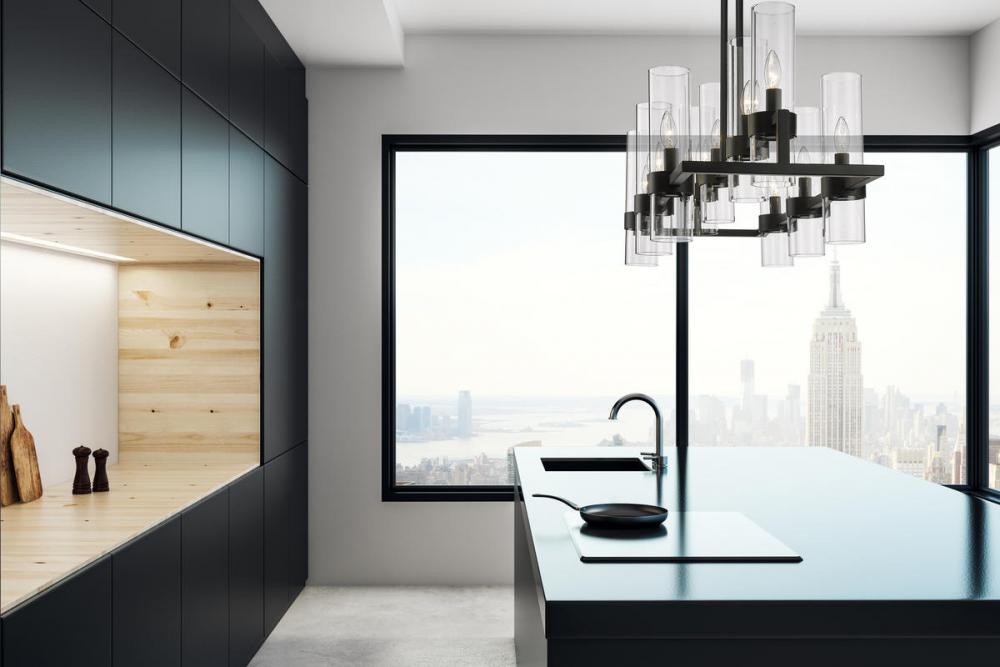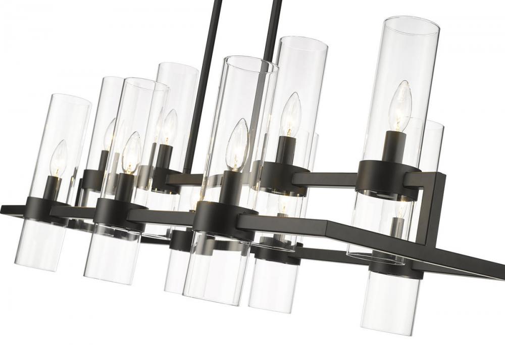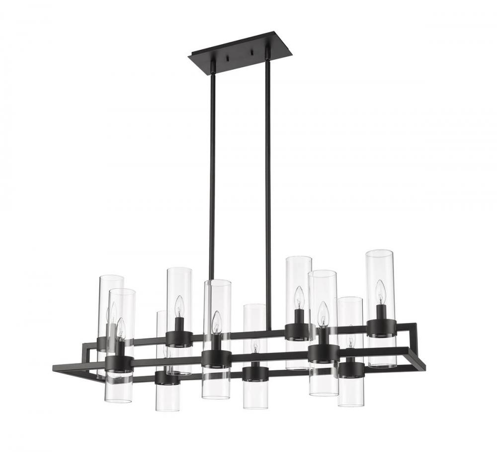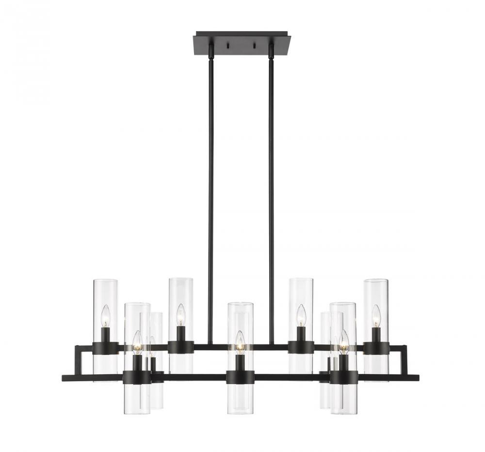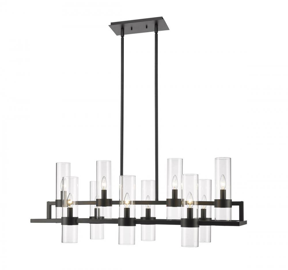 Upscale sophisticated style remains temperate and elegantly simple in the design form of this ten-light island and billiard light from the Datus collection. Show off a kitchen island or entertaining space with this linear-inspired pendant featuring solid iron with a bold matte black finish and delicate clear glass cylinders in two tiers. A light sense of drama adds romance and personality to this decadent light fixture.