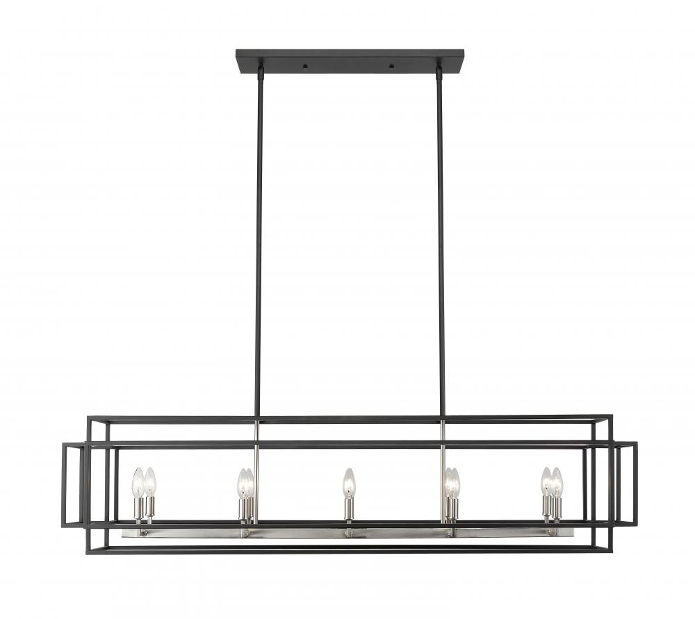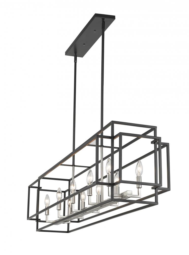 Bring a crisp modern look with softening effects, and choose this black and brushed nickel finish 10-light island pendant for a contemporary space. An eye-catching rectangular shape makes it a perfect fixture for illuminating a kitchen island or billiards space, and the architectural effect of an open-concept boxy steel frame highlights the delightfully traditional feel of candelabra-style bulb bases.