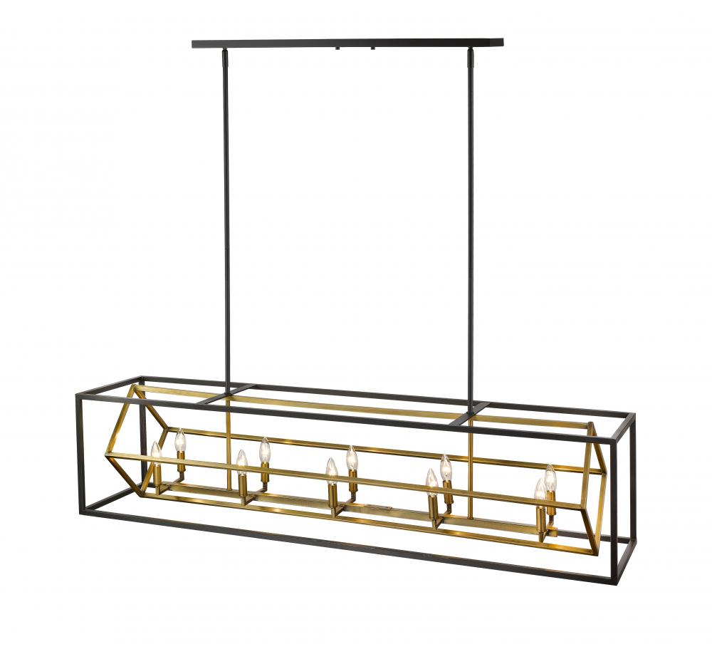 A brilliant architectural twist surprises and mesmerizes bringing an industrial inspired space to life with geometric cubes. Vintage olde brass and bronze finishes bring a sense of layered refinement to this rustic inspired ten-light island or billiard design.