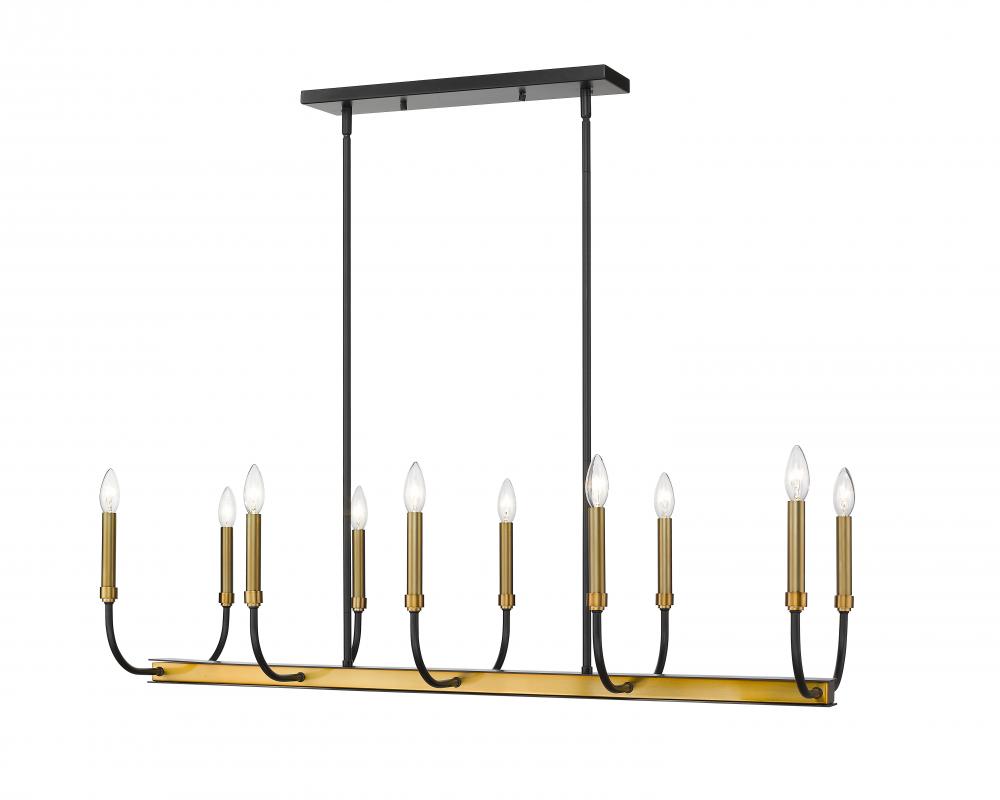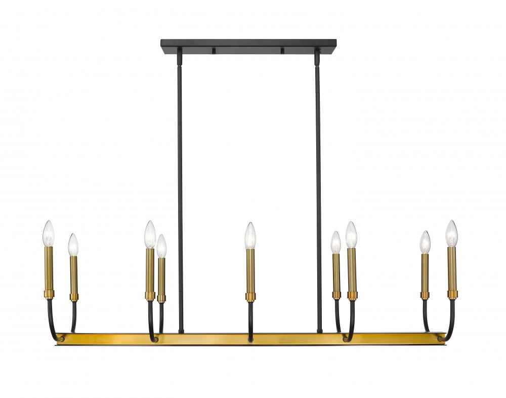 This fabulous two-tone ten-light island/billiard light is the perfect addition to your home lighting collection. Its crafted in a matte black and olde brass finish and features the lights in a candle-like design. Its the ideal light for the dining room, foyer, kitchen, or entertainment room.