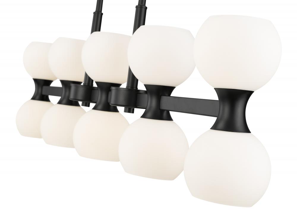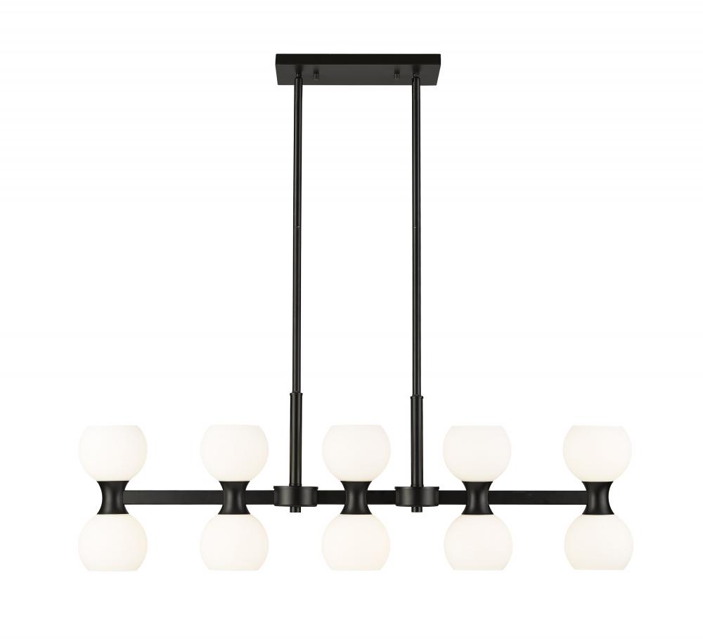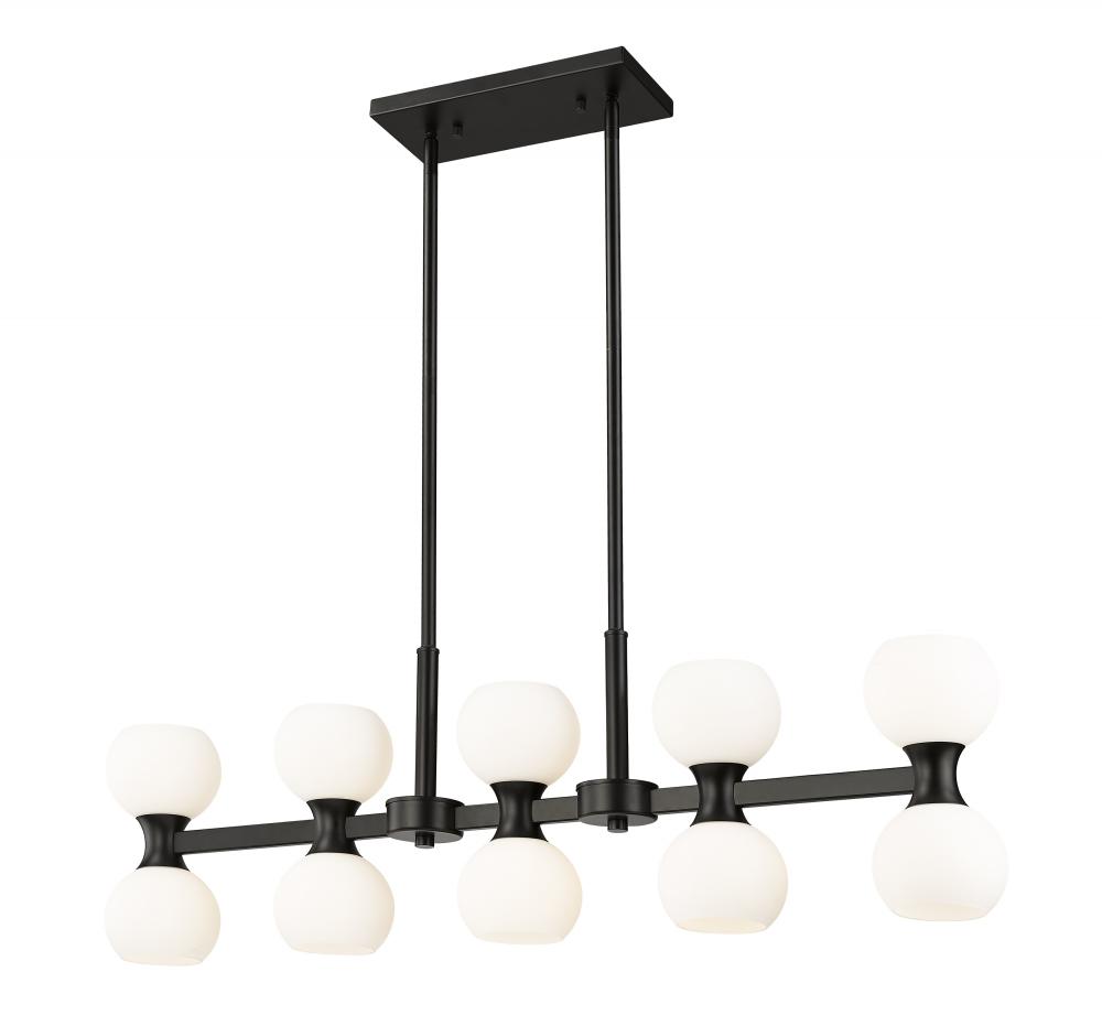 Repurposing Mid-Century Modern style goes a long way toward approaching lighting as d?cor, and this 10-light island light from the Artemis collection is a superb beginning. Linear elements juxtapose with artisanal rounded shapes in a transitional fixture with sharp finish contrasts. This island light features matte black finish steel framing and opal shades illuminating light both upward and downward, adding function and fashion to kitchens, living areas, and entertaining spaces.