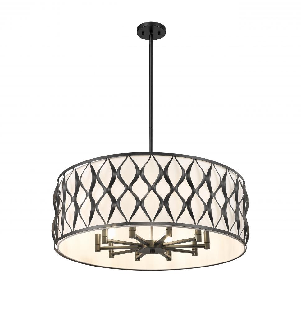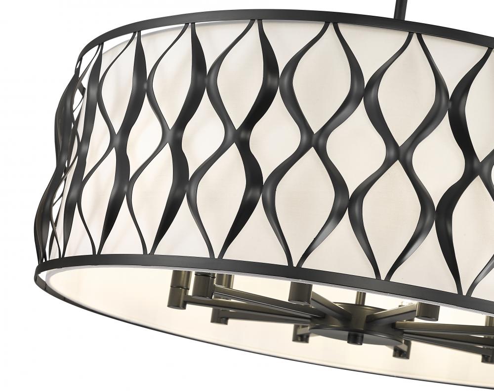 Romantic style details embellish this transitional ten-light pendant delivering timeless beauty and construction of bold matte black finish steel. A drum silhouette is aesthetically pleasing as this fixture offers artisan ribbon waves cascading vertically down its banded frame, and a soft white fabric diffuser maintains pleasing lighting effects. Candelabra-style lights and a round canopy complete a checklist of features that round out an iconic look in a pendant that adds elegance to kitchens, foyers, and dining spaces.