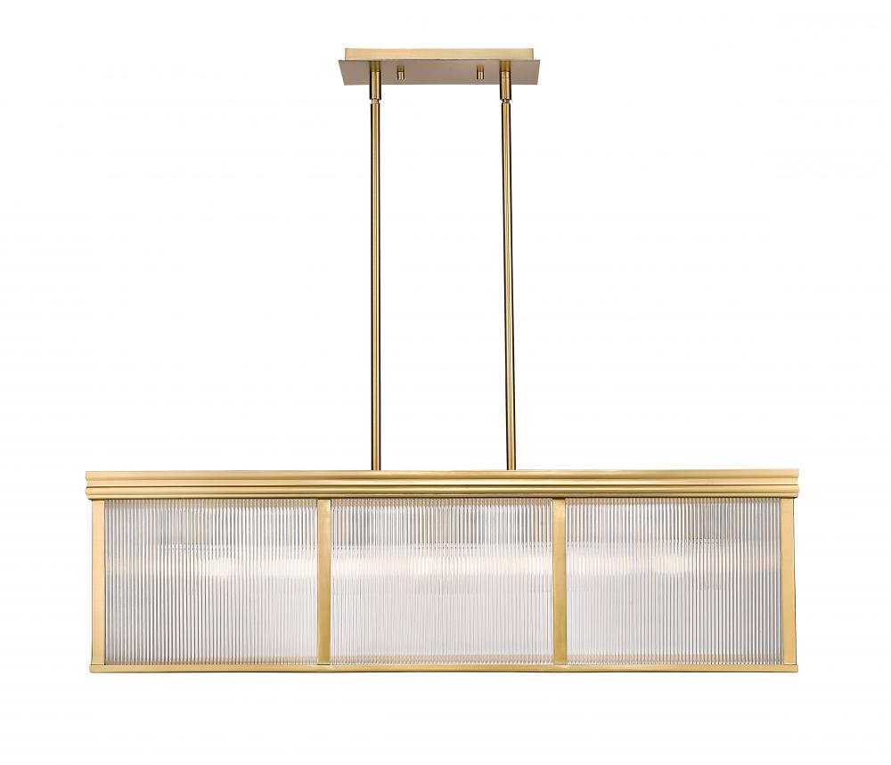 Clean lines and panes of architectural ribbed glass multiply the stylish character of a modern ten-light linear pendant. Striking over a kitchen island or gracing your foyer, its a distinctive look defined with a soft, modern gold finish and vertical striations in the glass that create a hint of opacity while reflecting light to create a warm, welcoming ambiance.