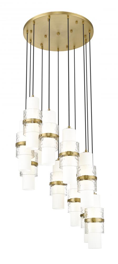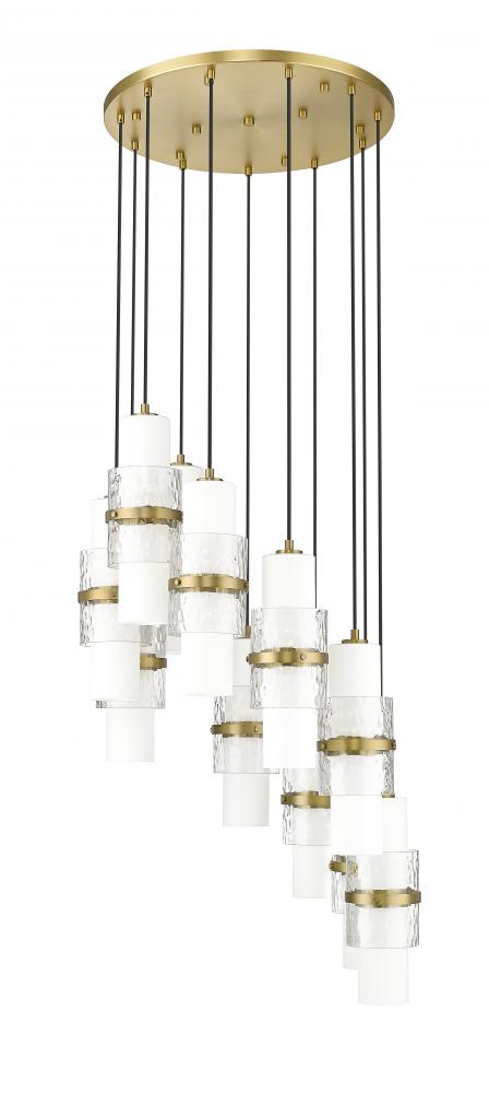 Stunning layers create rich dimension and depth for a modern 11-light chandelier. Surrounding each light, an etched opal glass cylinder is overlaid with clear textured glass and finished with a decorative modern gold finish cuff, creating a bold look that complements over your dining table or living room.