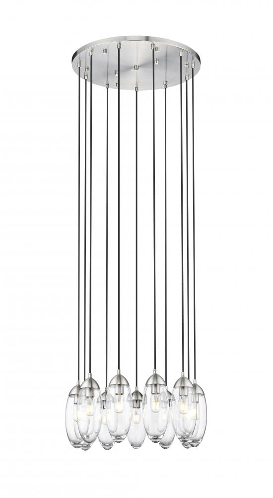 The intimately elegant effect of glasswork adds gleaming radiance to this glam 11-light chandelier. Illumination bounces off of cascading organic teardrop glass shades scattered to offer an abstract silhouette. With a tasteful round brushed nickel finish metal canopy, room or entryway customization becomes a key factor.
