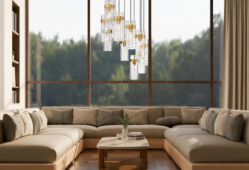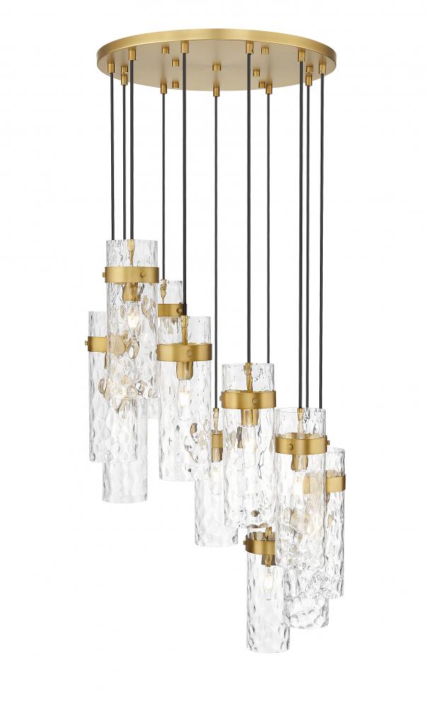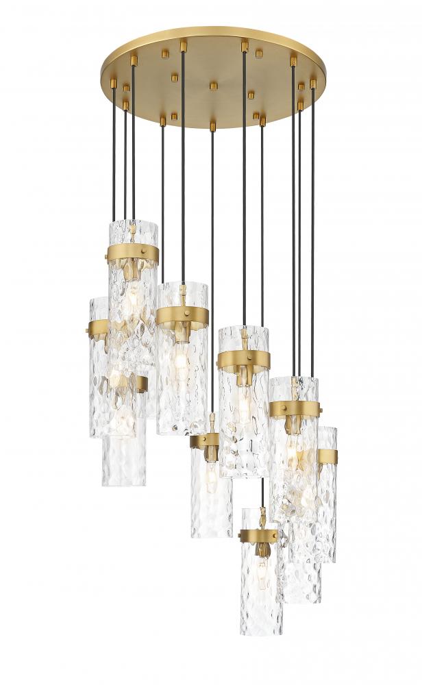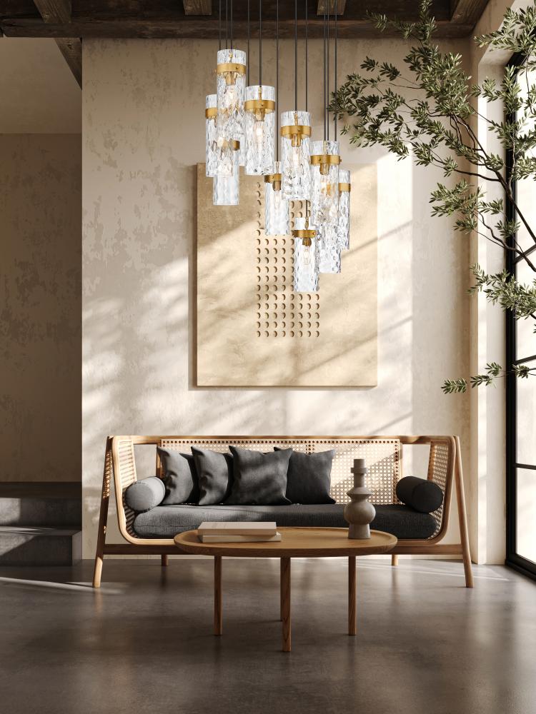 Gorgeous rubbed brass finishing highlights this modern 11-light chandelier. A perfect choice for a sophisticated space, it features a spiraling configuration of braided cord and rippled water glass. Metal collars complement each cylindrical shade, offering an elegant dose of warmth.