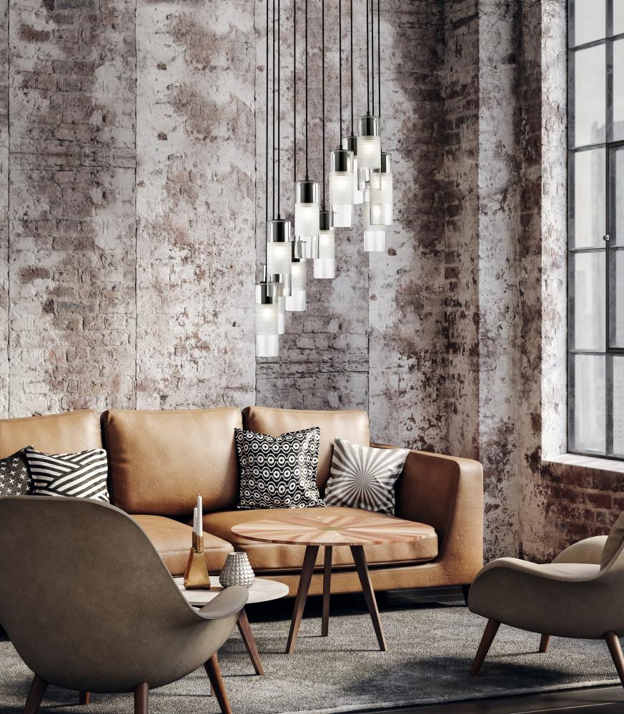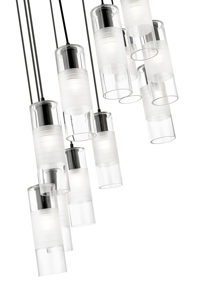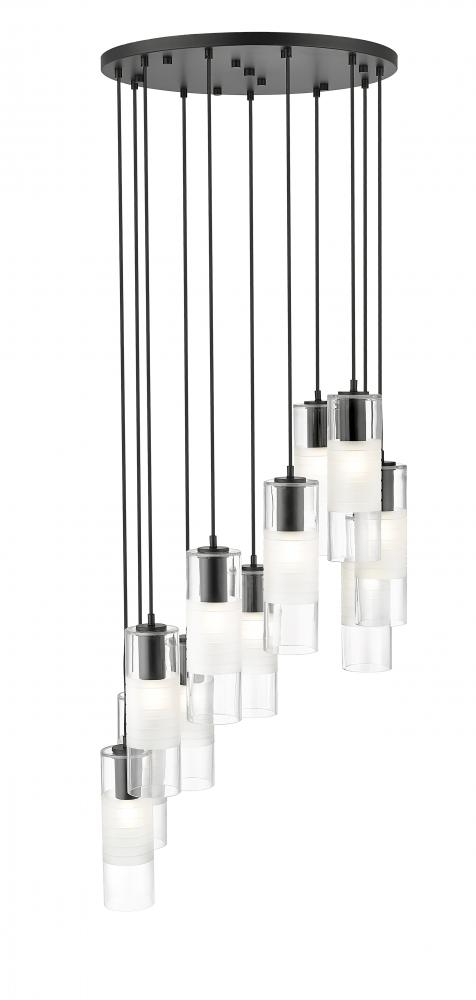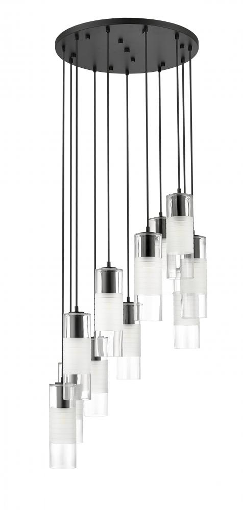 Chic artisan glass pairs with substantial steel housings to create a robust profile for a spiraling modern 11-light chandelier. Clear and frosted glass elements shade illumination to create lovely diffusion, offering exceptional ambiance over a dining table or foyer. Matte black finish adds a refined, high contrast touch.