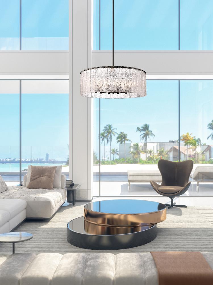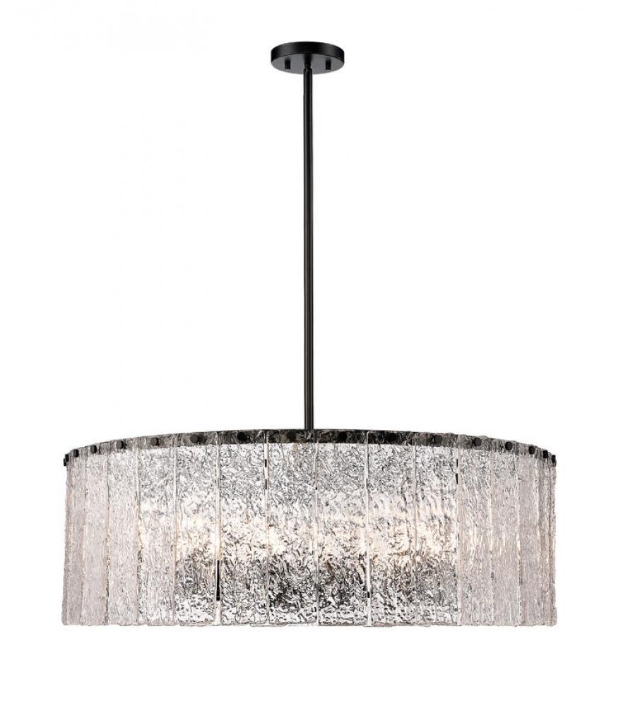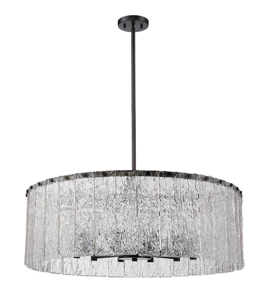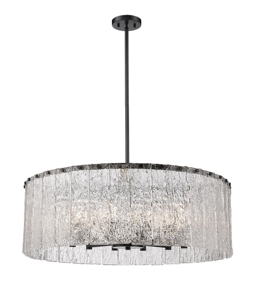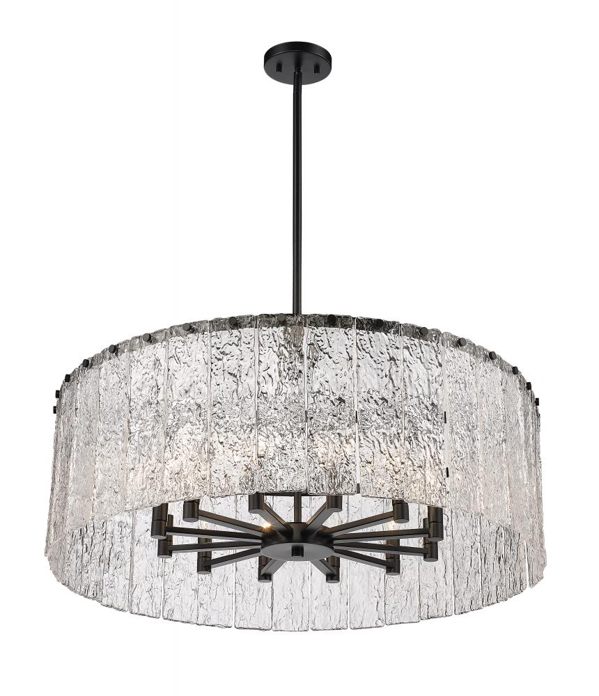 With a grand size and compelling design, this striking light fixture reflects a perfect mix of industrial and gallery design elements. The Glacier round twelve-light pendant offers a decadent look of individual clear textured glass panels that emulate melting ice, an extraordinary effect with dramatic impact in a foyer, kitchen, or main living area. Matte black finish steel is placed as a crown frame, adding a contrast in both style and finish and embellishing the optical delight accomplished when the fixture is illuminated.