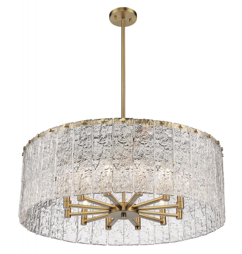 Choose gallery inspiration with a touch of minimal industrial artistry in a fixture that becomes a focal point. The Glacier round twelve-light pendant features clear textured glass panels that emulate melting ice, an incomparable effect with dramatic impact in a foyer, dining room, or main living area. Modern gold finish steel is placed as a crown frame, adding a consistency in palette and motif and embellishing a sought-after custom motif.